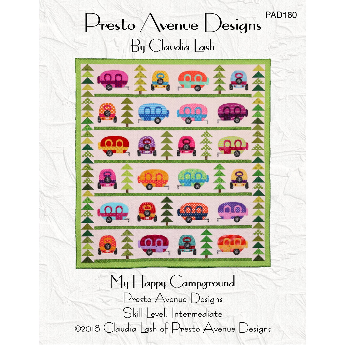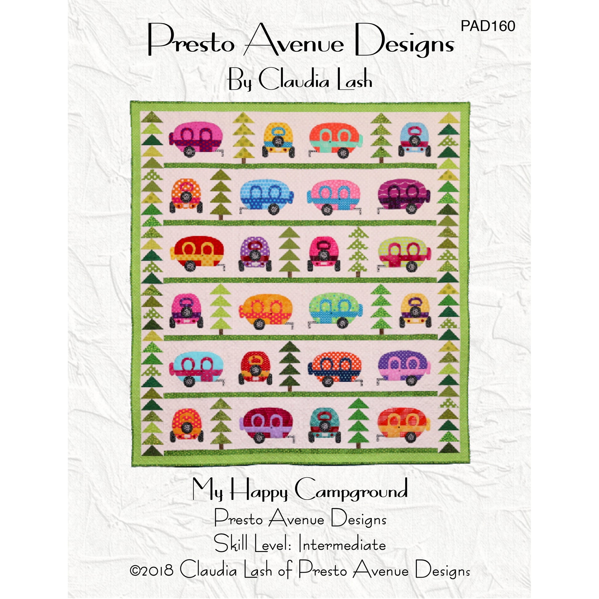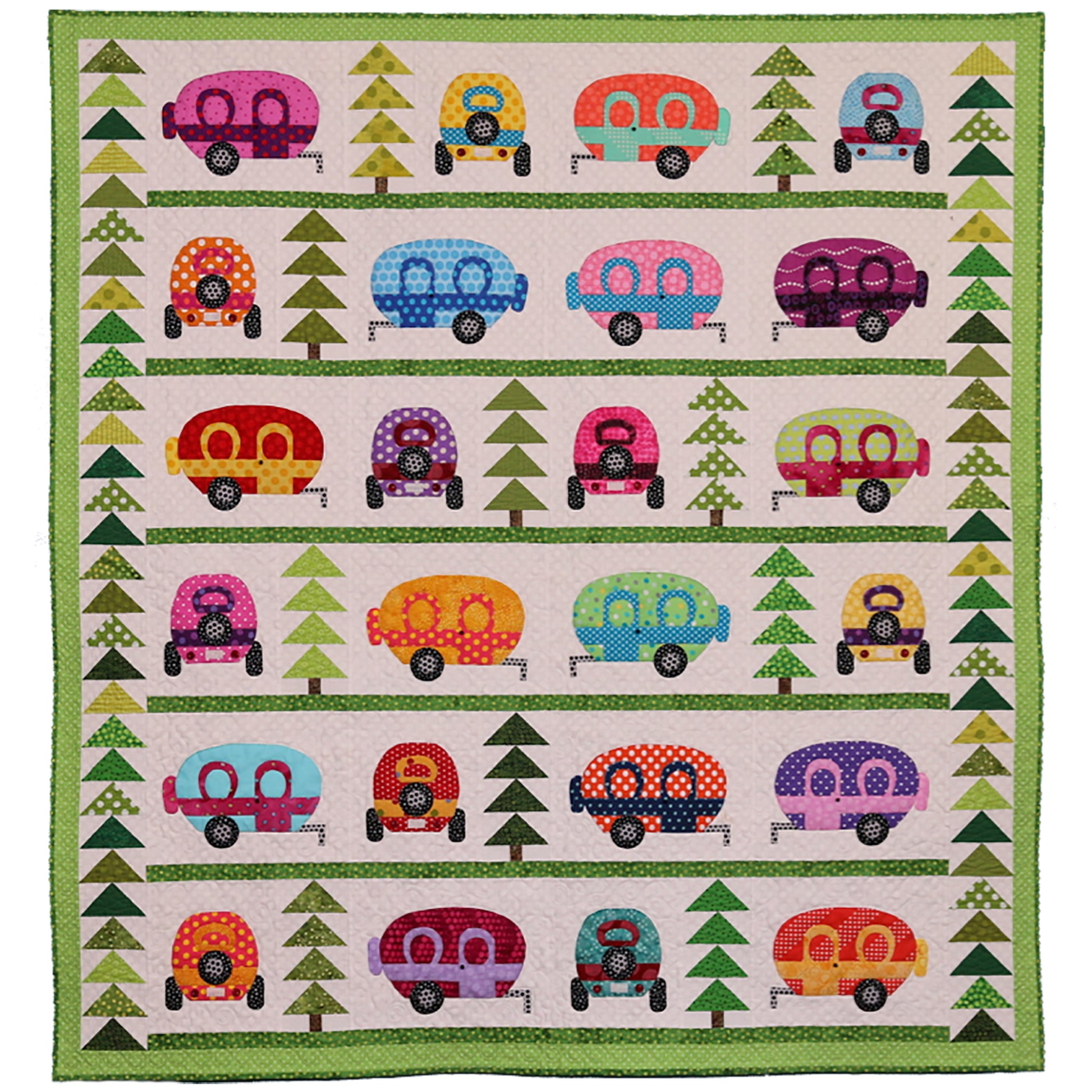 My Happy Campground quilt pattern is full of fun, happy campers surrounded by trees. The campers are easily machine appliquéd with a buttonhole stitch, and the trees are pieced flying geese. The pattern includes help for you to make the quilt smaller (wall hanging) or larger (twin).