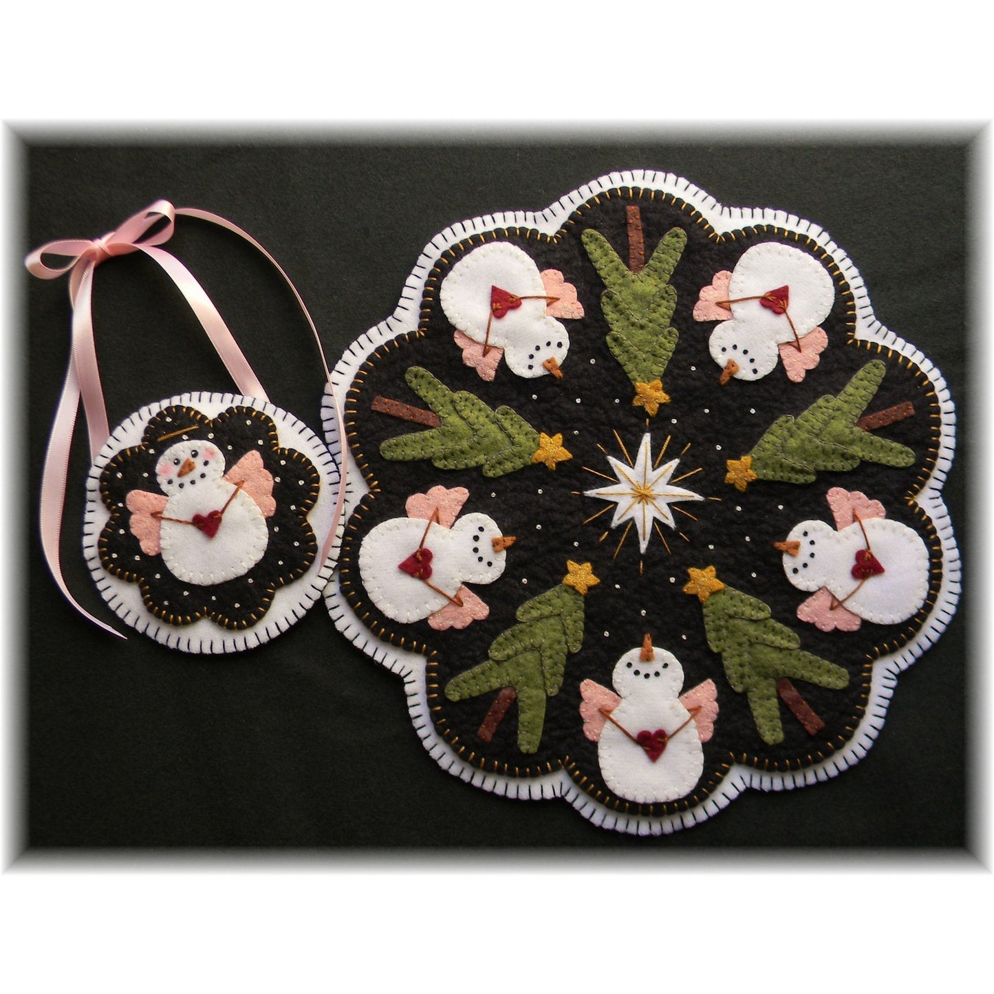 Sweet little snow angels gaze lovingly at the star in the sky on this pretty candle mat pattern. Stitch it up using wool or wool felt. The smaller mat can be used as a coaster or a hanger for a doorknob, hook or Christmas tree.