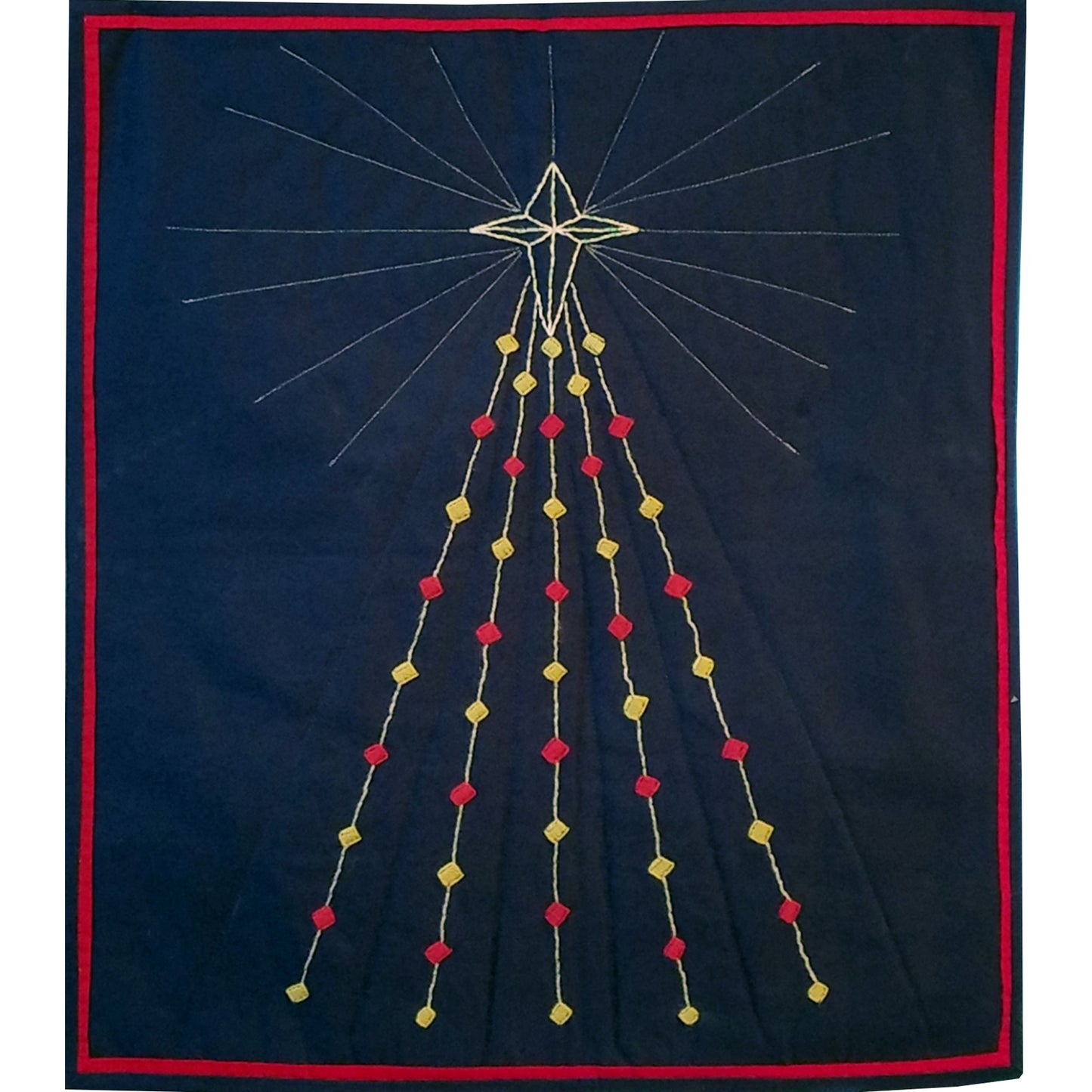 A modern quilt based on the decorative lawn “String Trees” light up the Holidays. Pieced wall hanging quilt pattern with an embroidered center design.