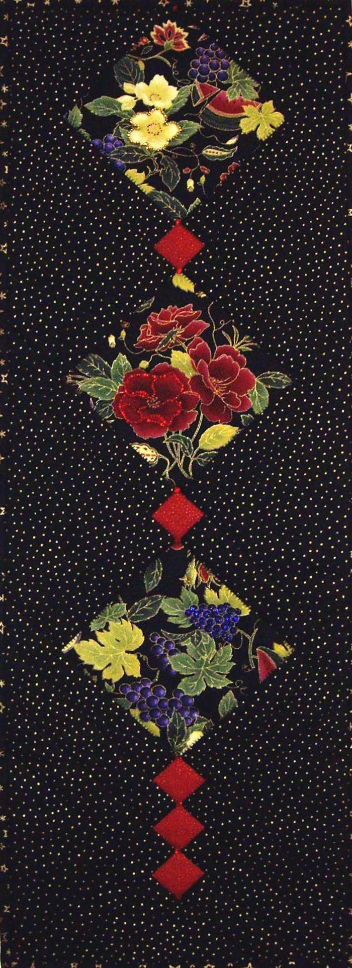 The kite patches are fused to the background fabric. Kite wall hanging pattern.