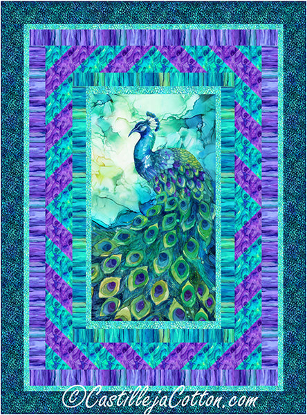 Peacock panel with a simple pieced borders. Fabric shown in the sample quilt is Northcott Fabrics Allure (Available 2023-11-01). Colors: turquoise, purple, blue