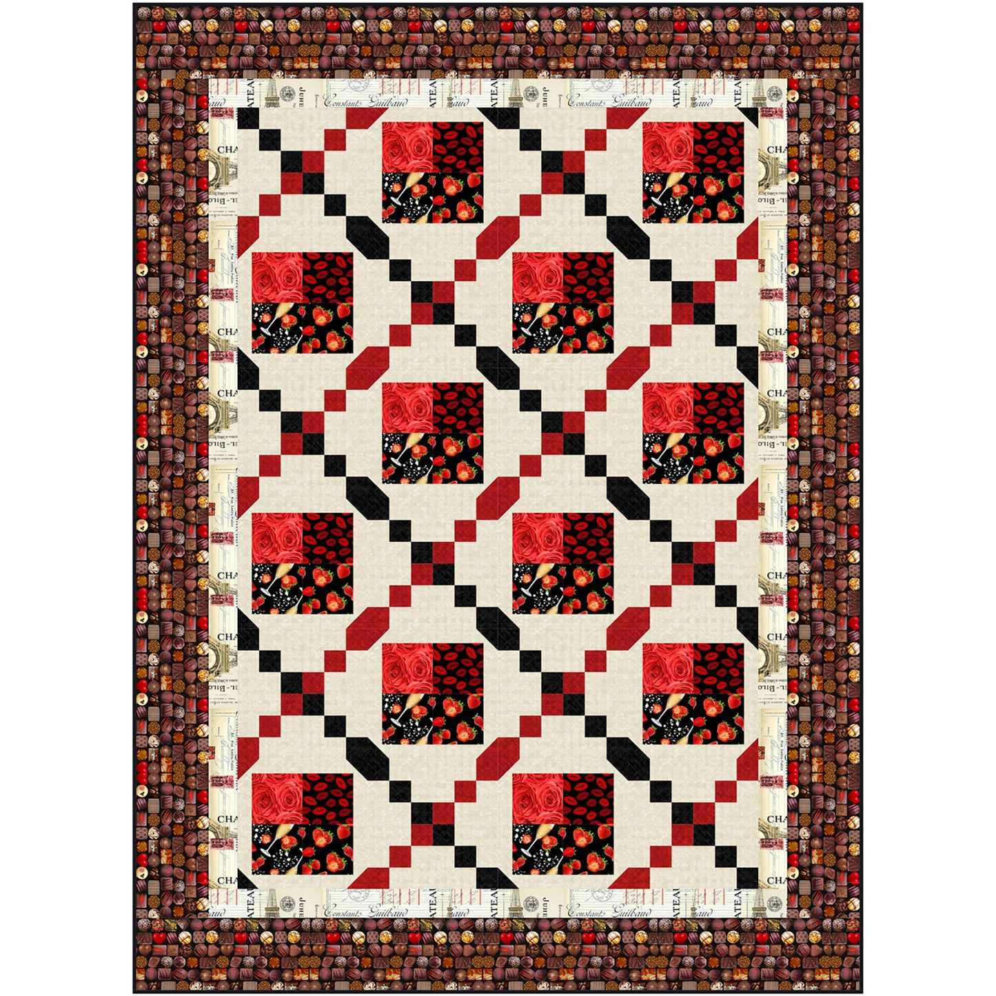 Framed four patch blocks alternated with a chain block. Fabric shown in the sample quilt is Timeless Treasures Fabrics Rendezvous (Available 2024-11-01). Colors: red, black, cream