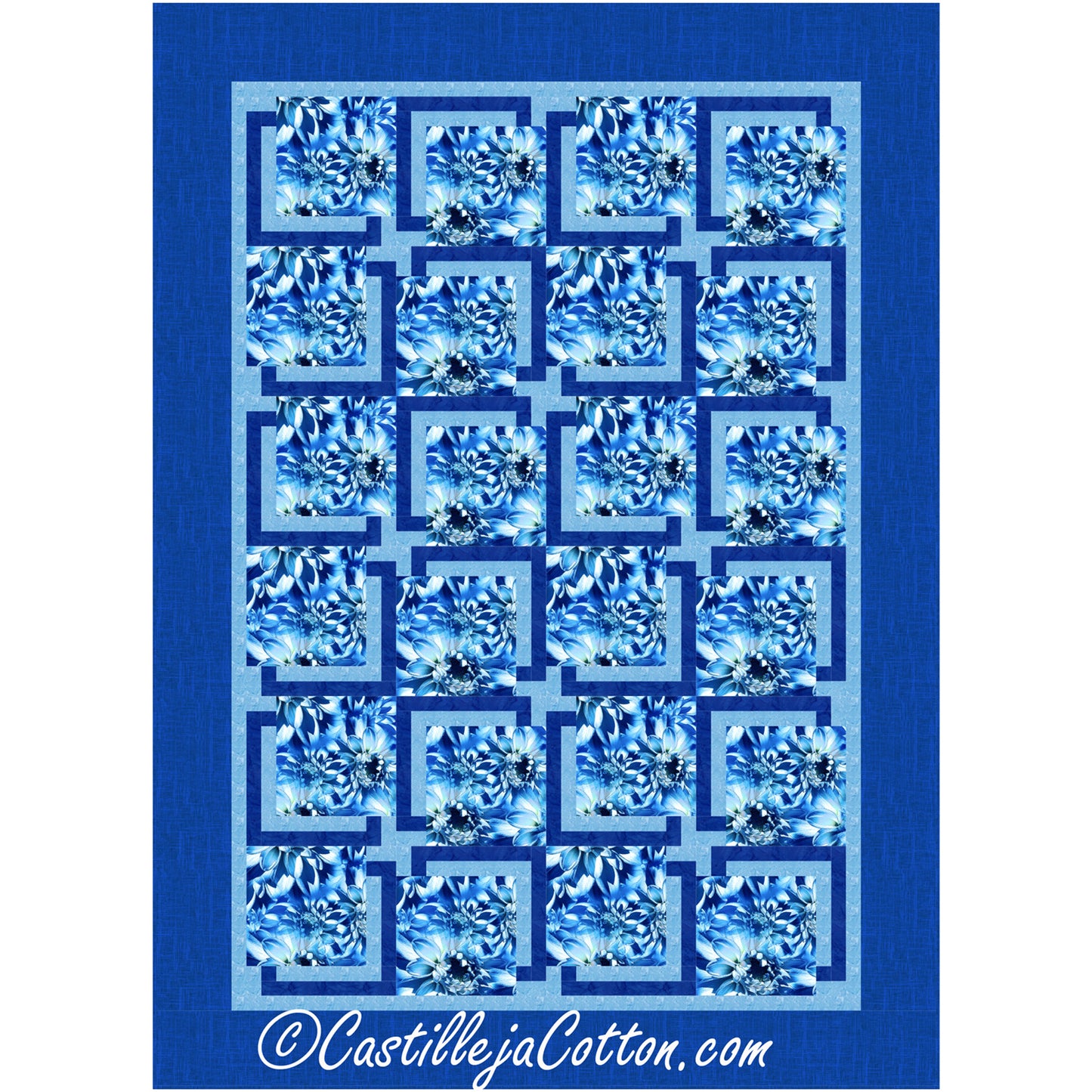 A stunning quilt pattern featuring a combination of blue and white colors, embellished with lovely blue and white flowers. The squares design is so fun and can complement so many fabric choices.