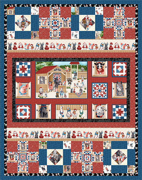 A fun panel quilt that would be great in a country cabin or a child's room. Pieced panel quilt pattern.Fabric shown in the sample quilt is Dressed Up on the Farm by Blank Quilting.**