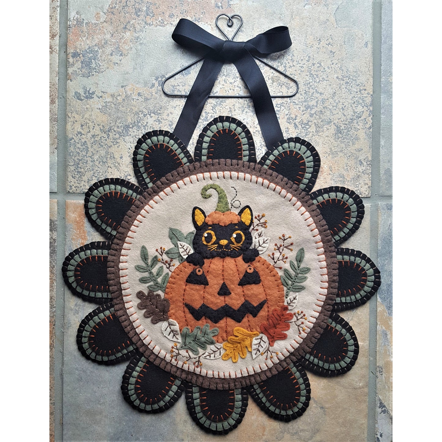 This sweet little black cat is simply irresistible! Stitch up this adorable Halloween candle mat using wool or wool felt in wonderful Autumn colors! The completed mat measures approximately 12 inches and is quite easy to create. Placed on a table or hanging on a wall, it's sure to give your home a fun and festive look.