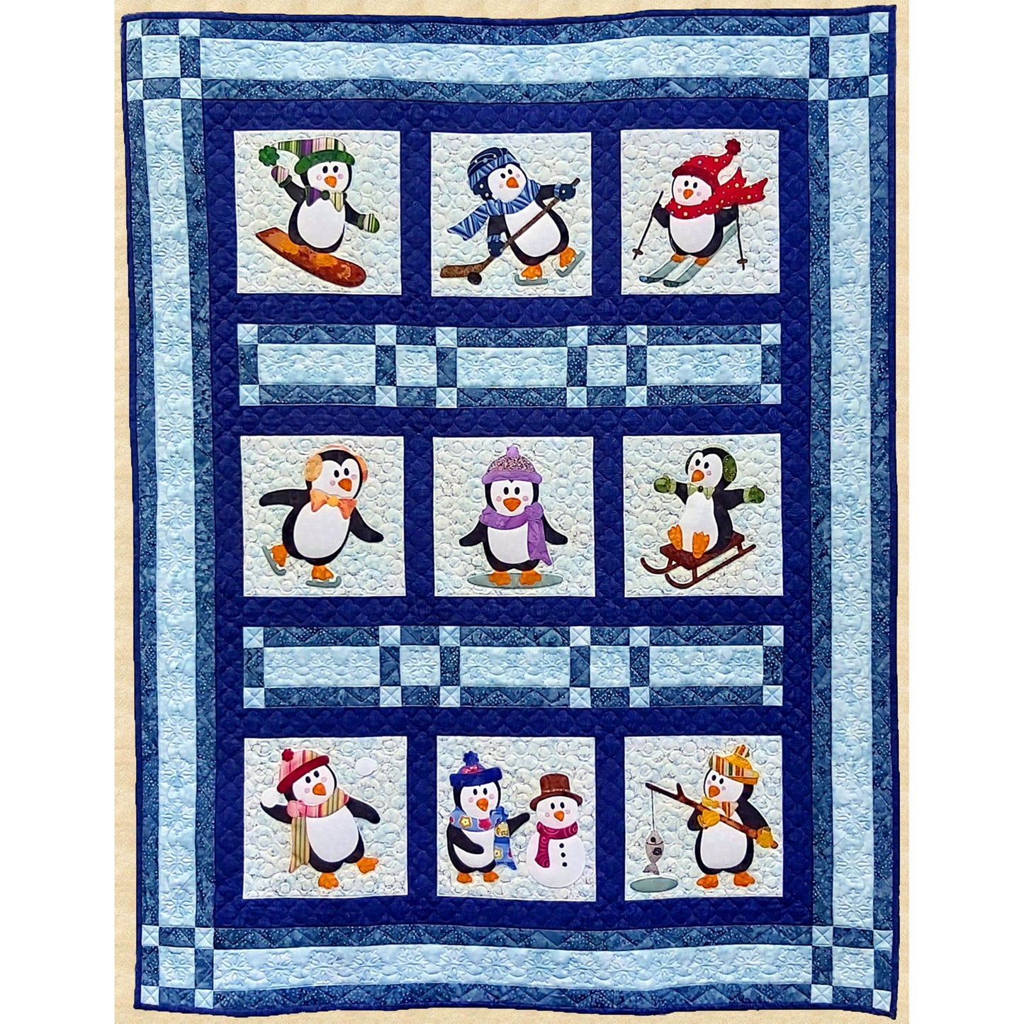 A parade of penguins dressed for winter and participating in all kinds of winter activities are featured in this cute quilt.