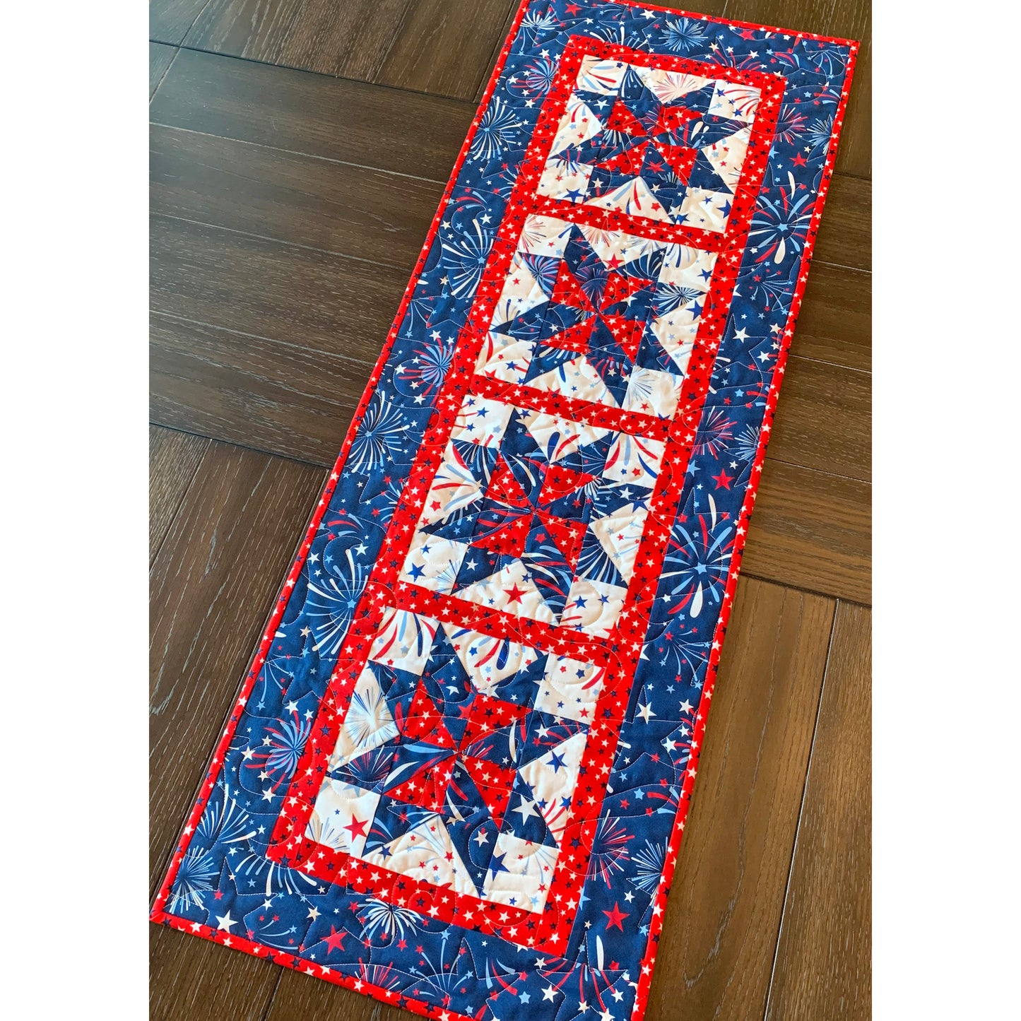 Pinwheel Stars combines the traditional Pinwheel and Sawtooth Star blocks for a festive and fun runner. Looks great scrappy as well! Pattern includes fully illustrated diagrams with easy to follow instructions. Suitable for any level quilter. Finished runner size is 15" X 42".