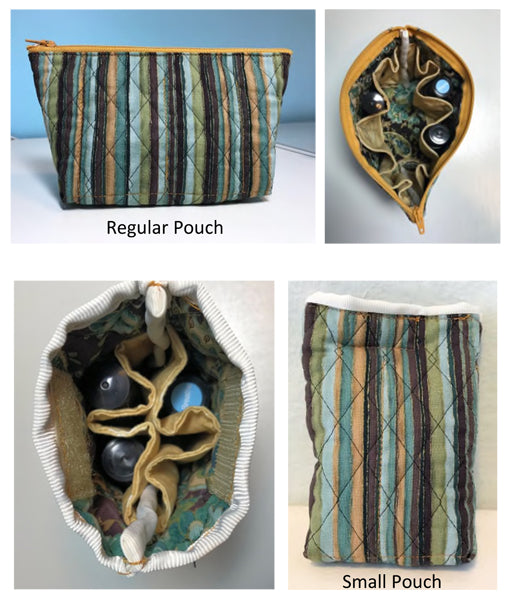 This pattern has instructions for two sizes. The regular pouch is 7 3/4" x 4 1/2", zippered, has 8 interior pockets, and a center section. Small pouch is 4 1/2" x 5 1/4", and has velcro, 4 pockets, and a center section. For convenience it uses pre-quilted fabric.