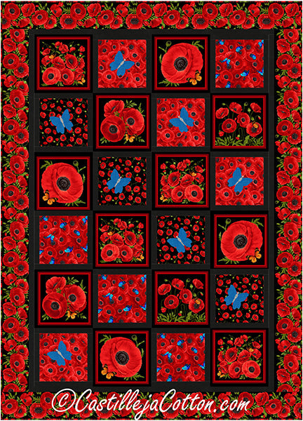 This quilt pattern uses two fabric panels with simple, fusible appliqued butterflies. Fabric shown is Timeless Treasures Fabrics Wild Poppies.