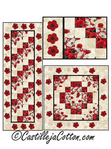 Make a table mat 35" by 35" or 4 placemats 18" by 12" or a table runner 57" by 21". Fusible applique poppies embellished these pieced placemats, table mat and table runner. Table set pattern.