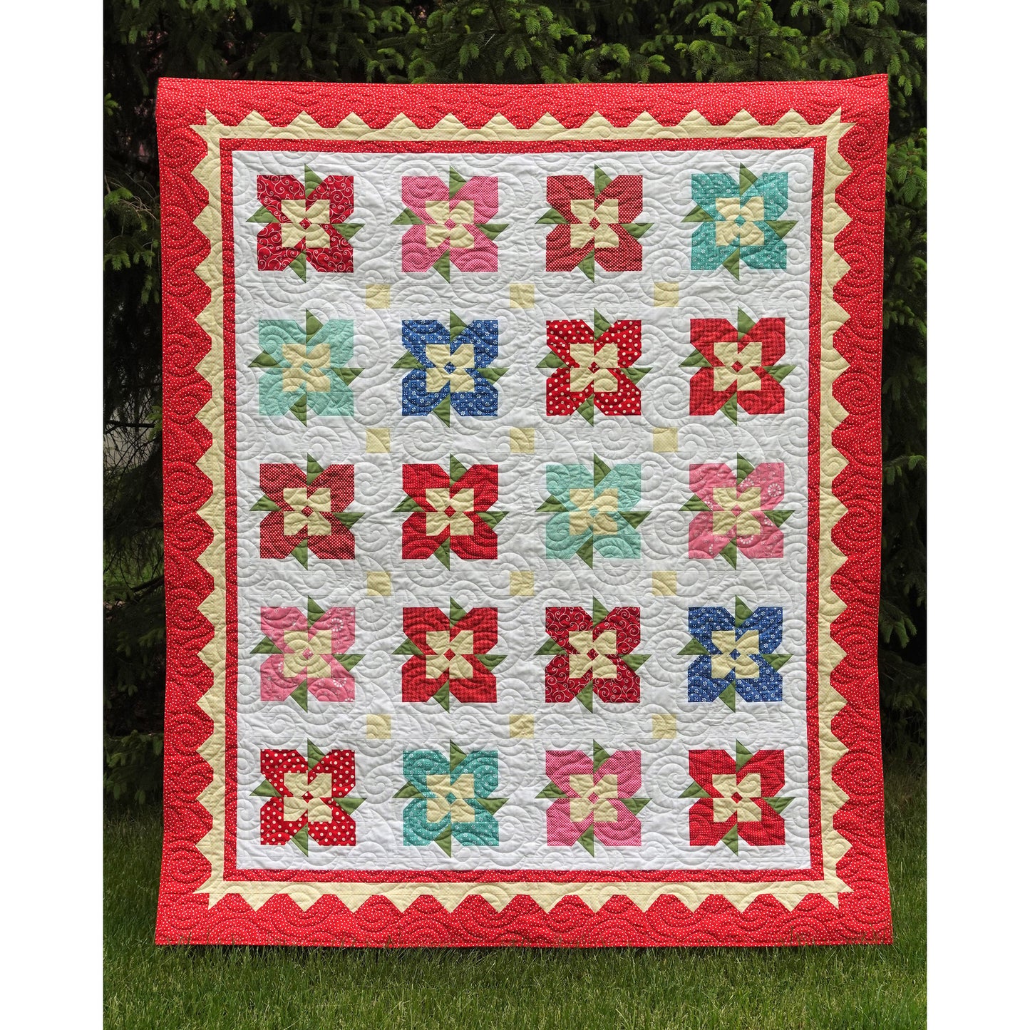 Brighten any room with this garden-inspired quilt for spring, summer, or any season. Stitch-and-flip construction lets you sew these beautiful flower blocks without worrying about cutting triangles or sewing bias edges. Pattern includes 5 sizes, each with separate cutting instructions for clarity: baby (36 x 48), small throw (48 x 60), large throw (60 x 72), twin (64 x 88), queen (88 x 100). (Sizes stated in inches.)