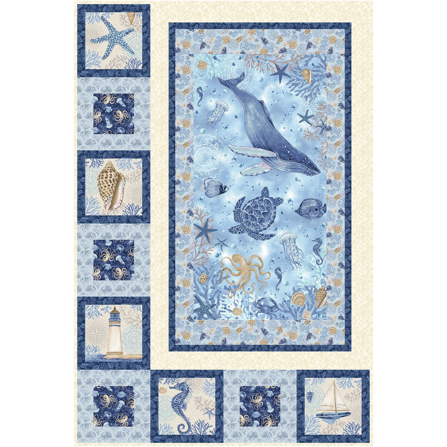 This beautiful modern gallery quilt pattern features a panel and coordinating fabric squares. A great way to showcase your favorite panel or large print fabric. Fabric shown in the sample quilt is from the Cobalt Seas line of fabric from Henry Glass.**