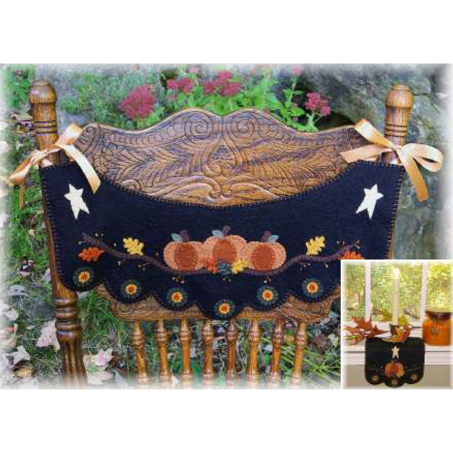 Beautiful Autumn colors make this pattern set a warm and welcome addition to your Fall decorating! This pattern is very easy to make using wool felt or wool. The colors are simply breathtaking! The chair swag measures 16" across and 6" long at the center point. The windowsill mat is 7 1/2" wide and drops about 6" over the sill edge. Display right through Thanksgiving!