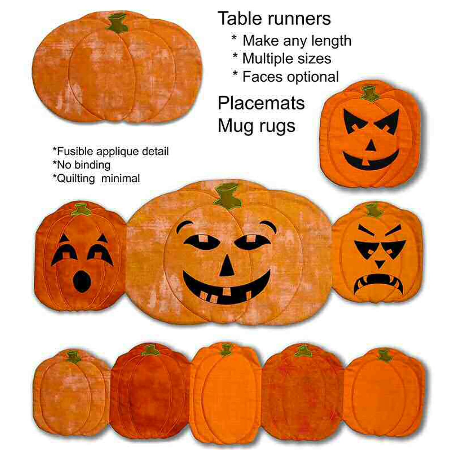 Whip up enough pumpkins or Jack O'Lanterns to fill the house with matching table runners, placemats, mug rugs and potholders. Make the table runners as many pumpkins long as needed. Add details with a touch of fusible web and satin stitching.