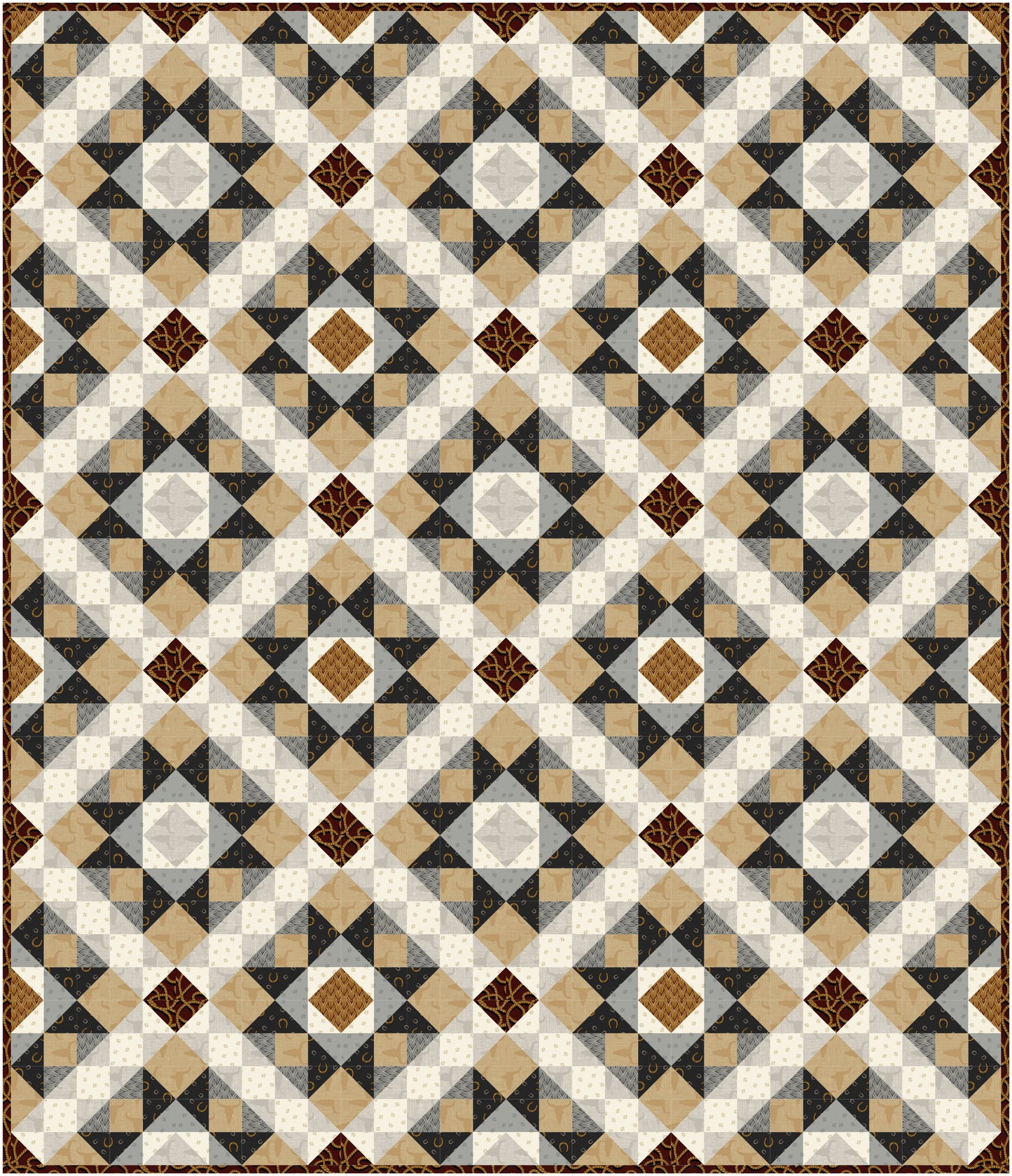 Introducing "Ranch Hand Stars" quilt pattern, inspired by the rugged charm of the Wild West! This design showcases the captivating prints from the Ranch Hand fabric line by Andover Fabrics (sample shown). With a combination of bold colors and intricate motifs reminiscent of the prairie landscape, this quilt promises a dramatic visual effect that will transport you to the heart of the ranching country. The pattern features striking star blocks set against a backdrop of rustic hues, creating a captivating interplay of light and shadow. Whether you're a seasoned quilter or a novice, "Ranch Hand Stars" offers a creative journey through the untamed beauty of the American West. The quilt finishes at 60" x 70".