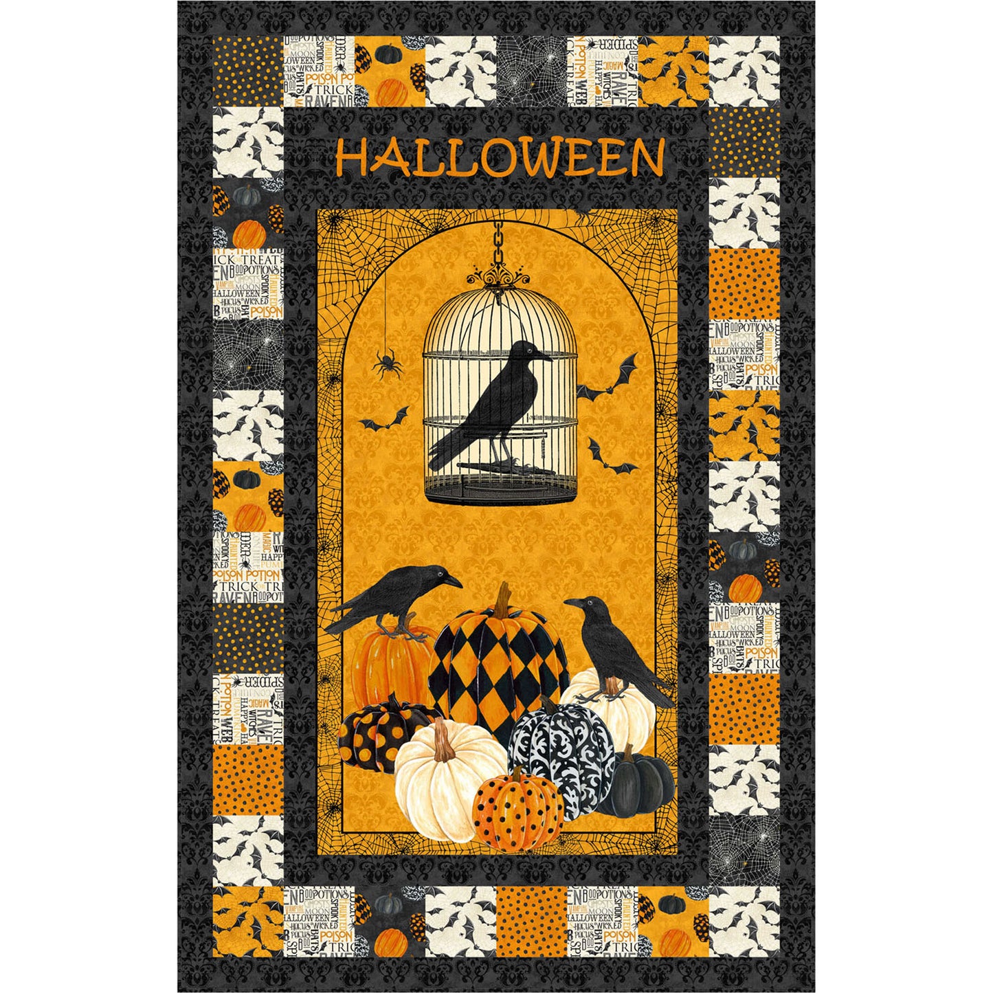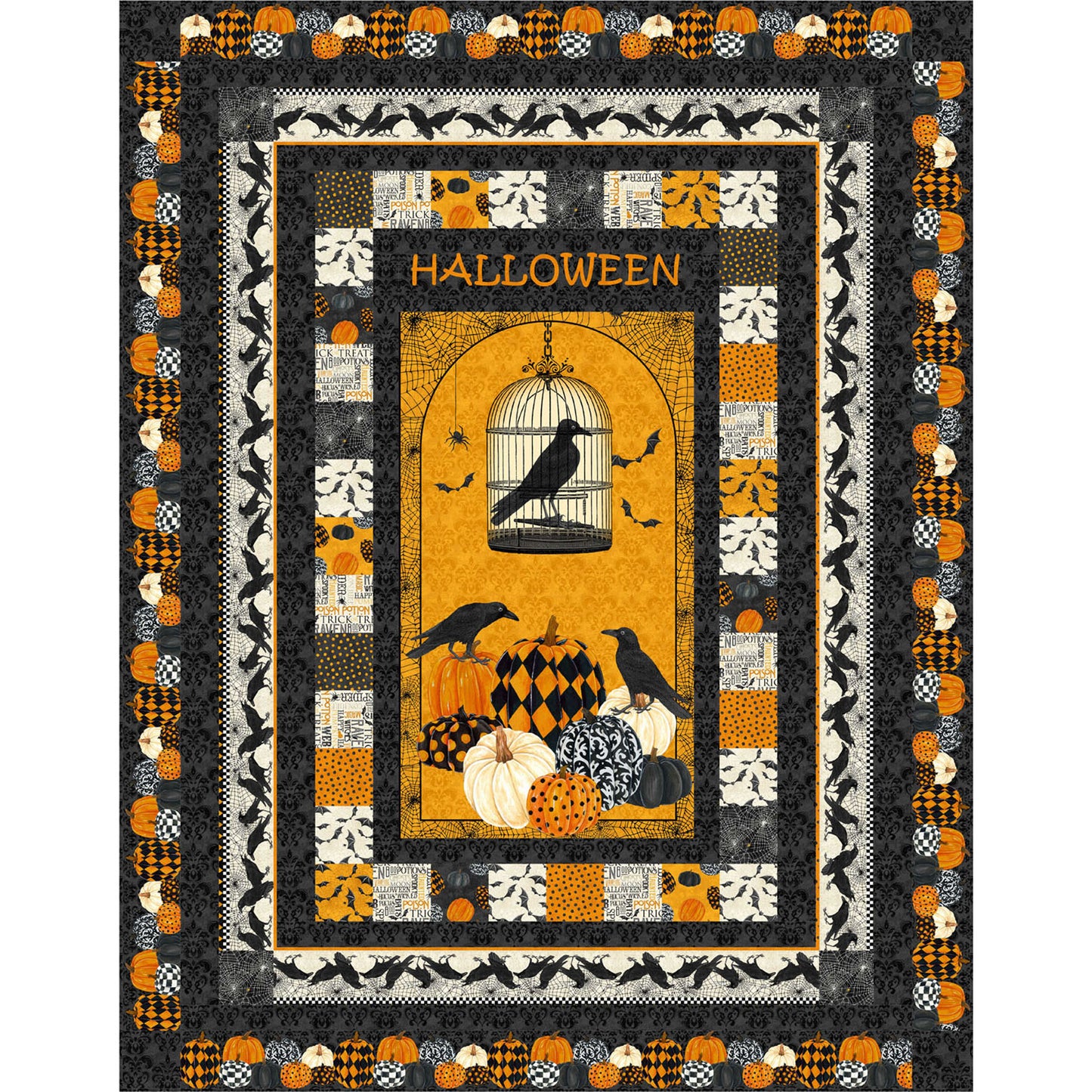 We used the “Raven’s Claw” fabric line by Northcott to create this spooky Halloween quilt. The large panel quilt is framed with the digitally printed stripe featuring the pumpkins and ravens. You’ll get lots of border practice with this design, but don’t worry! The pattern contains detailed instructions to give you Well-behaved borders that lie nice and flat.
