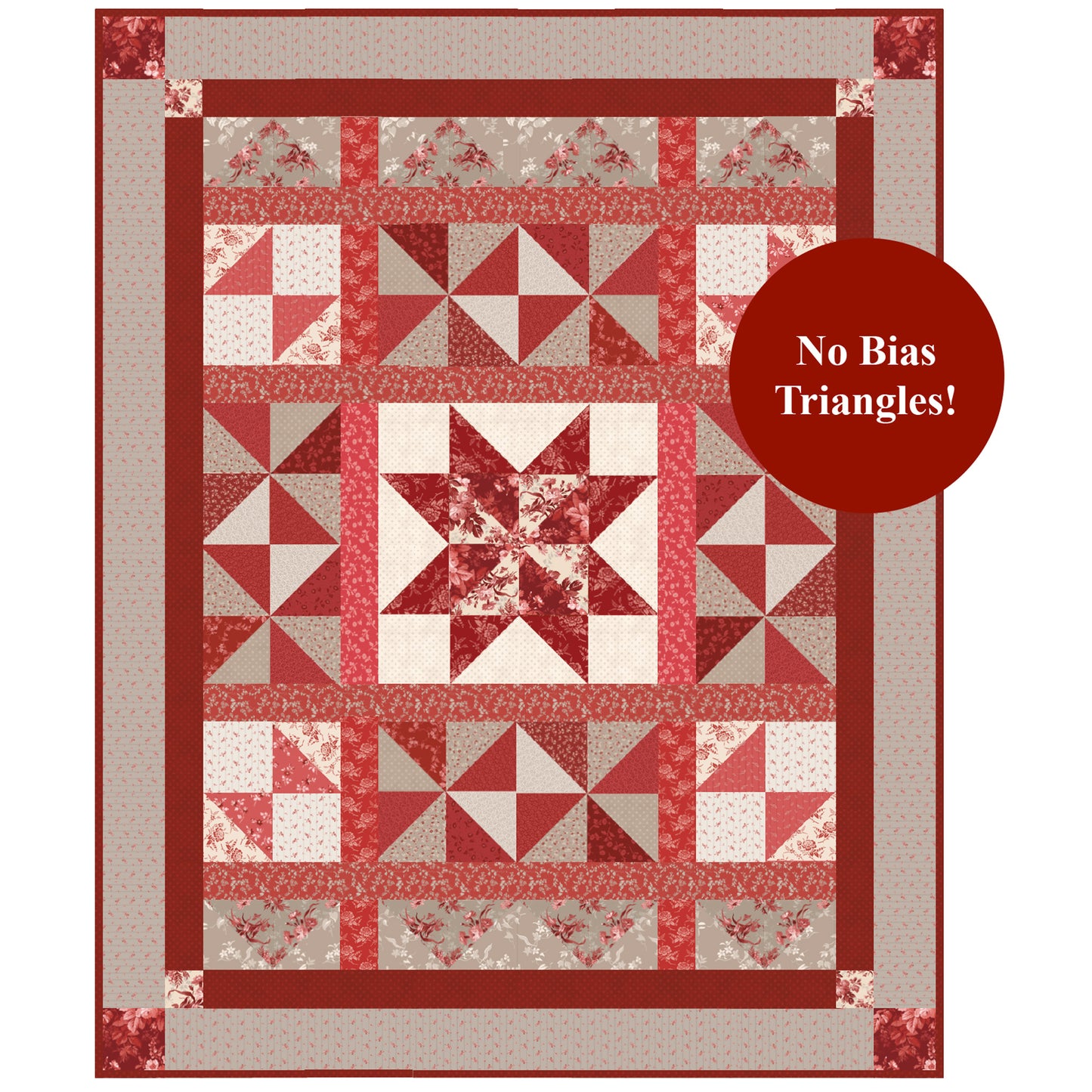 This lovely “Red Elegance” quilt is a half-quare triangle sampler including Godey, Windmills, Flying Geese, simple variation of Bow Ties and Squares; with sashing, borders and cornerstones. Reference the Yardage Charts (pages 2 and 3) for color/value references.