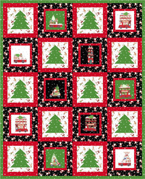 Sample quilt features fabric from the Double Decker Christmas by Northcott Fabrics fabric line.