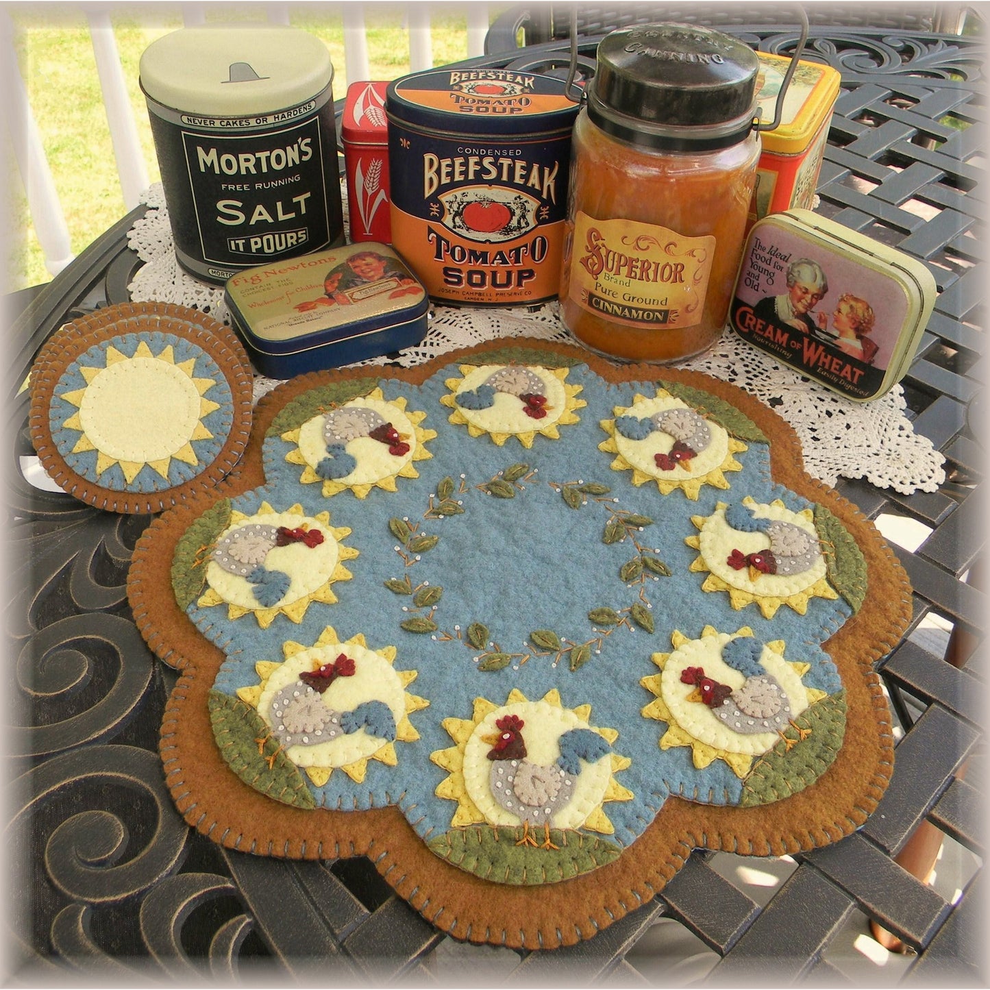 These colorful roosters are up with the sun! The colors in this pattern are very retro and will brighten up your country decor. A unique piece that can be stitched up using wool or wool felt. The completed mat measures approximately 13 inches. Each of the 4 mini mats/coasters measure 4 inches. A fun little blast from the past!