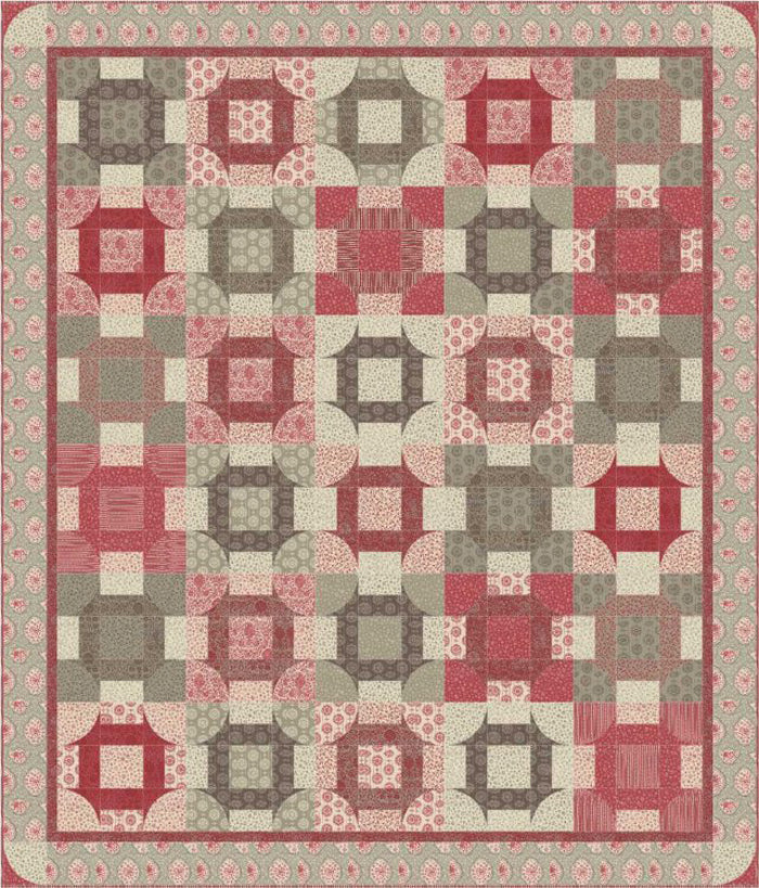 This scrappy quilt pattern gives the look of curves without curved piecing by combining two traditional block designs into one. Terry started with the Churn Dash block layout and combined it with a Cathedral Window technique of turned back bias in the corners. Stop after the first border for a more contemporary look or add the second border, finished with the curved look of the blocks in the cornerstones. The quilt pattern contains fat quarter cutting diagrams and detailed graphics to make the steps easy to follow. It is suitable for a strong beginner with patience and attention to detail.