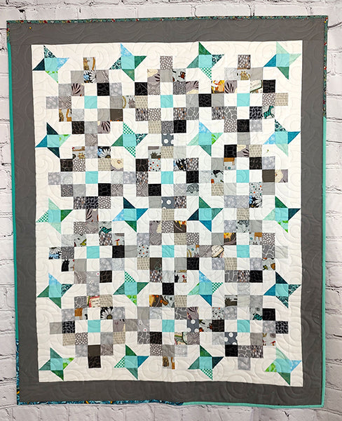 Pick two colors of scraps and a background color and cut out squares and triangles to create this fun quilt. The turquoise squares are protected and in safety inside the grey squares.
