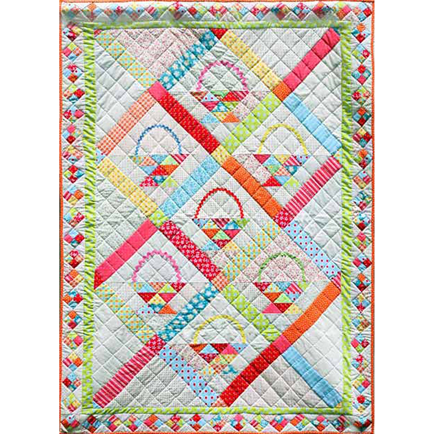 This quilt pattern features adorable baskets overflowing with fun! Use fat eights and some other fabric for this fun scrappy-looking quilt pattern.