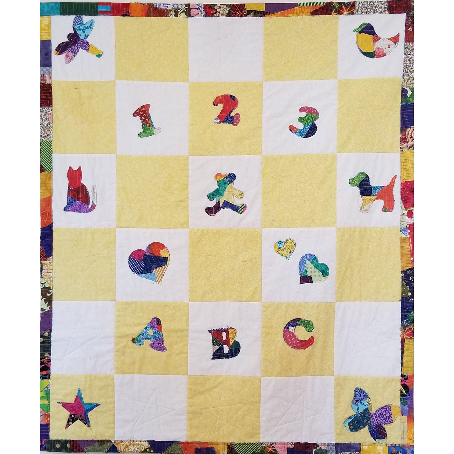 Pieced baby/crib quilt pattern with scrappy applique shapes. GO! friendly pattern. Templates are provided also.
