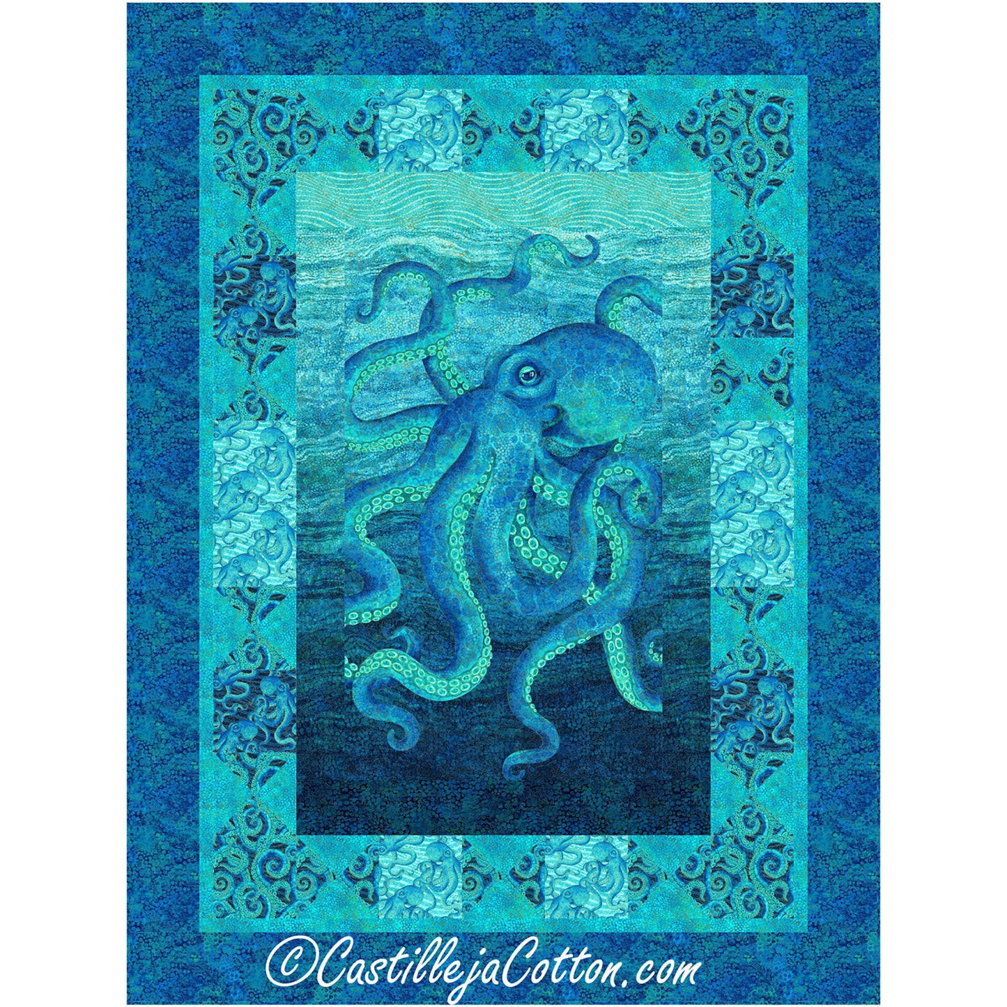 Octopus panel with simple pieced borders. Fabric shown in the sample quilt is Northcott Fabrics Enigma (Available 2024-12-01). Colors: blue, teal