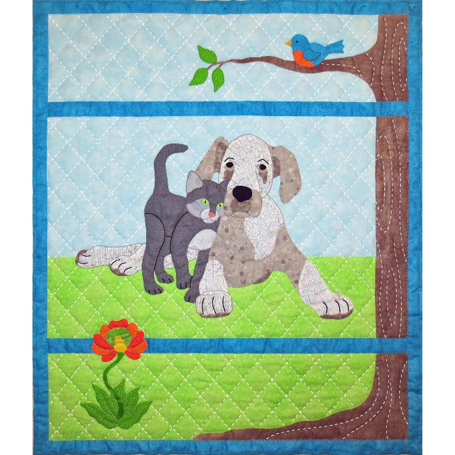 Applique the kitten, puppy, flower, bluebird and tree on a pieced background. Suitable for hand, machine or fusible applique. Hand or machine quilt pattern.