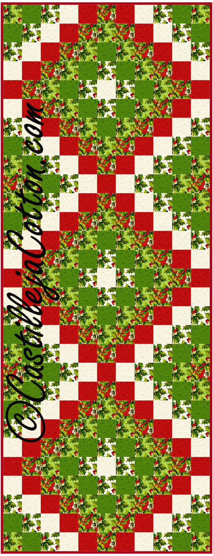 Easy to make large table runner or sofa back quilt pattern. Great use of 6 fat quarters. Fabric line shown is Home for the Holidays by Deborah Edwards for Northcott.