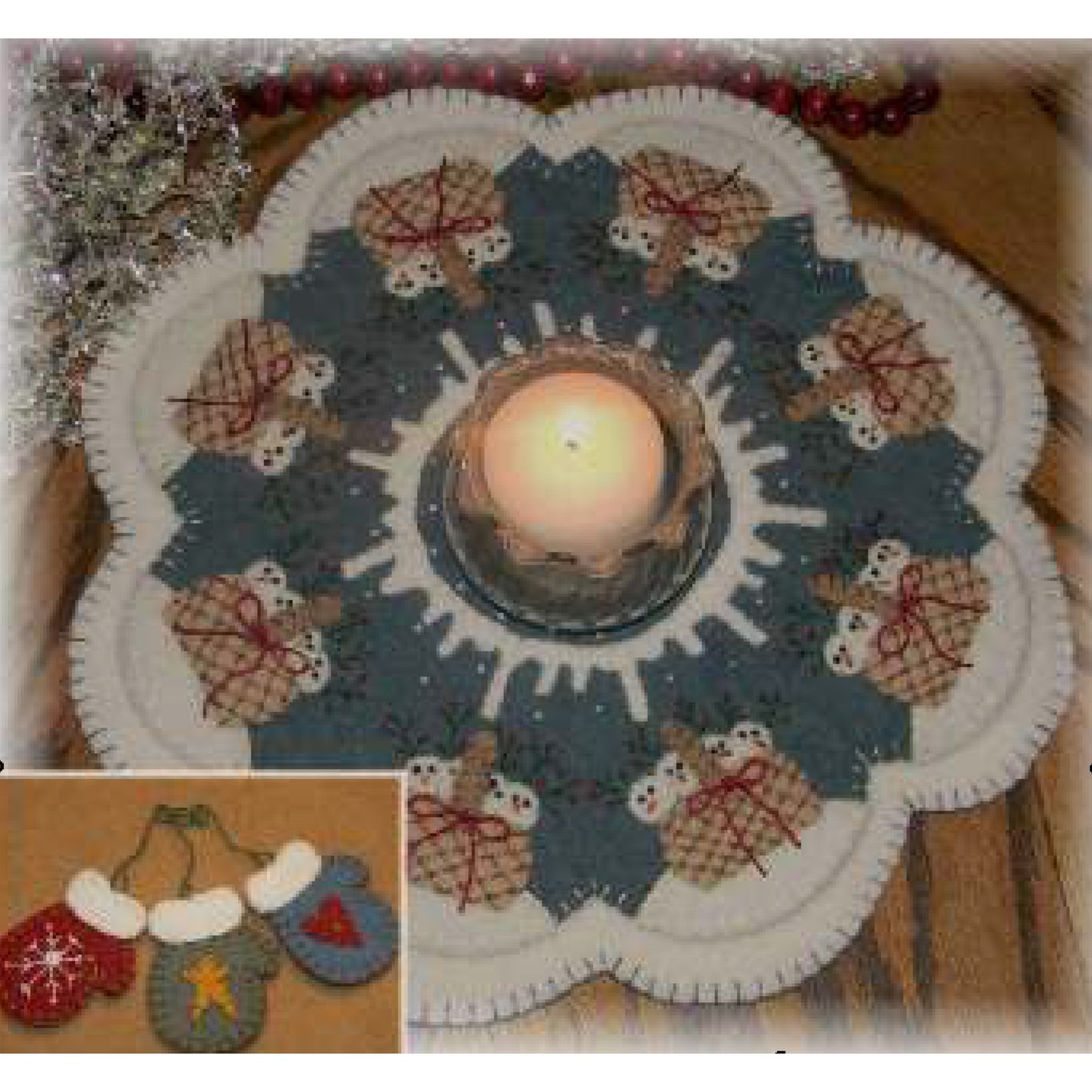 Winter snow babies fill embroidered baskets with sweet frozen charm! Stitch up this adorable pattern with wool or wool felt. Add a favorite candle to the center for warmth on even the coldest day. The candle mat measures approximately 13 inches and each of the ornies measure about 2 inches wide by 2 1/2 inches long. A sweet winter decoration!