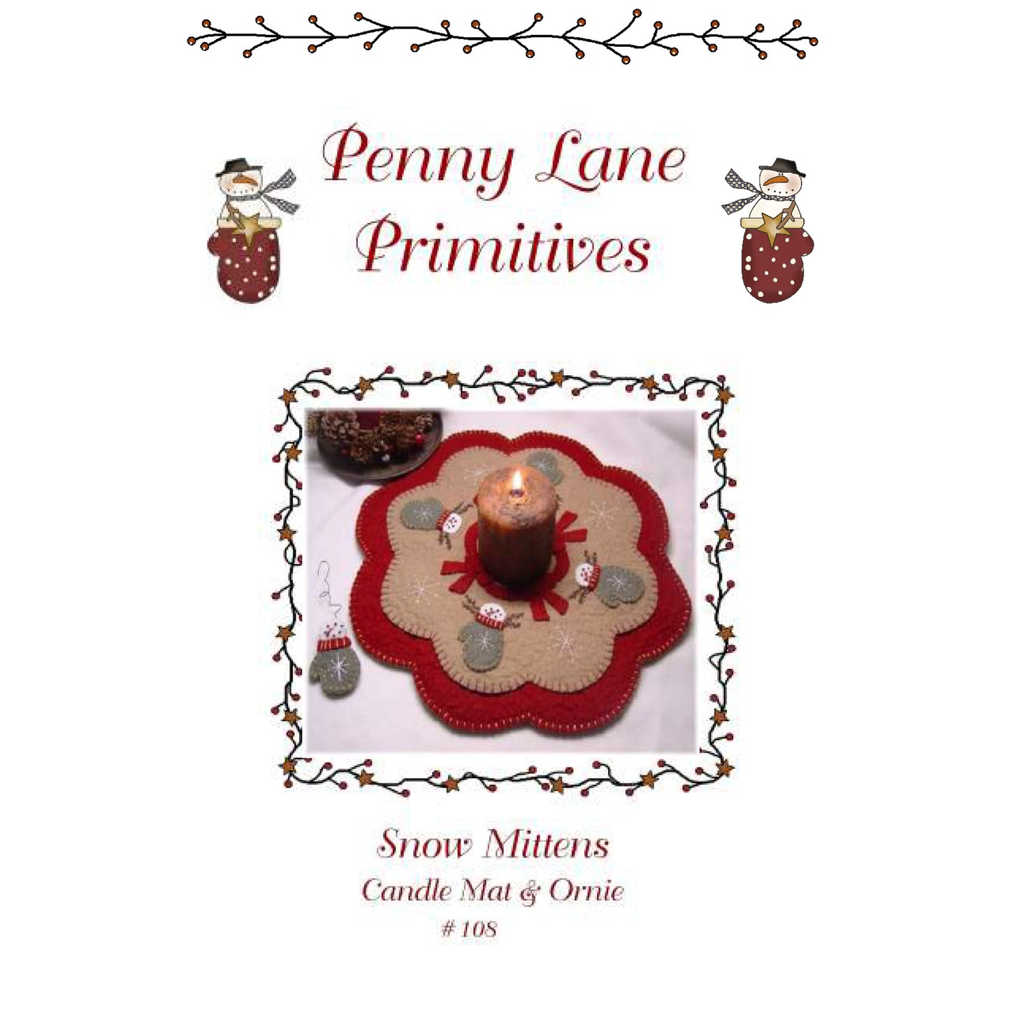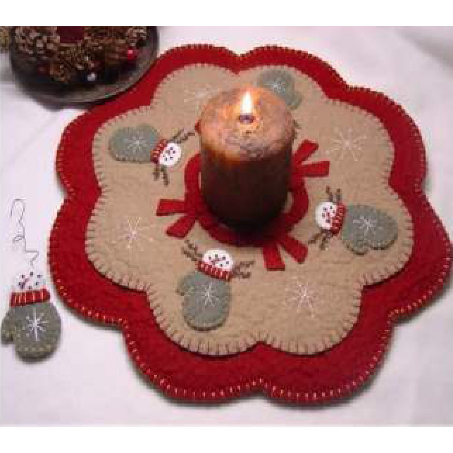 Sweet little snowmen peek out of the tops of warm woolen mittens. They are just the cutest! The completed candle mat can be made with wool or wool felt. It measures approximately 14 inches but may be enlarged to any size you like! Also included in this pattern are the directions for a 2 by 2 1/2 inch ornie. Adorable set! This would be such a nice set to make as a Christmas gift for someone special. Very unique & totally one-of-a-kind!