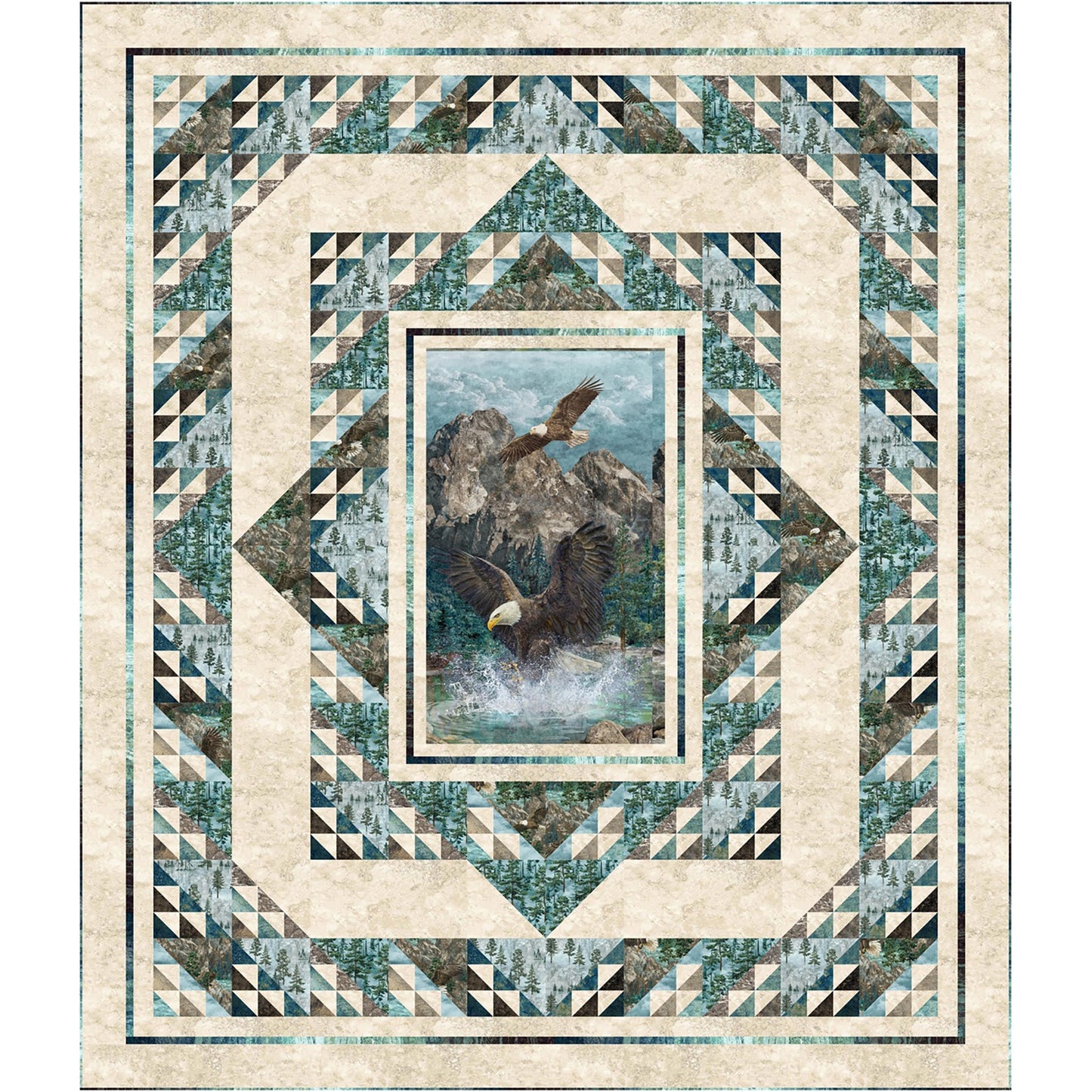 Frame a stunning birds-of-prey panel with a series of borders featuring Birds-in-the-Air blocks for a picturesque quilt in one of 3 sizes. Upsize it to twin/double or queen with just a few more borders.