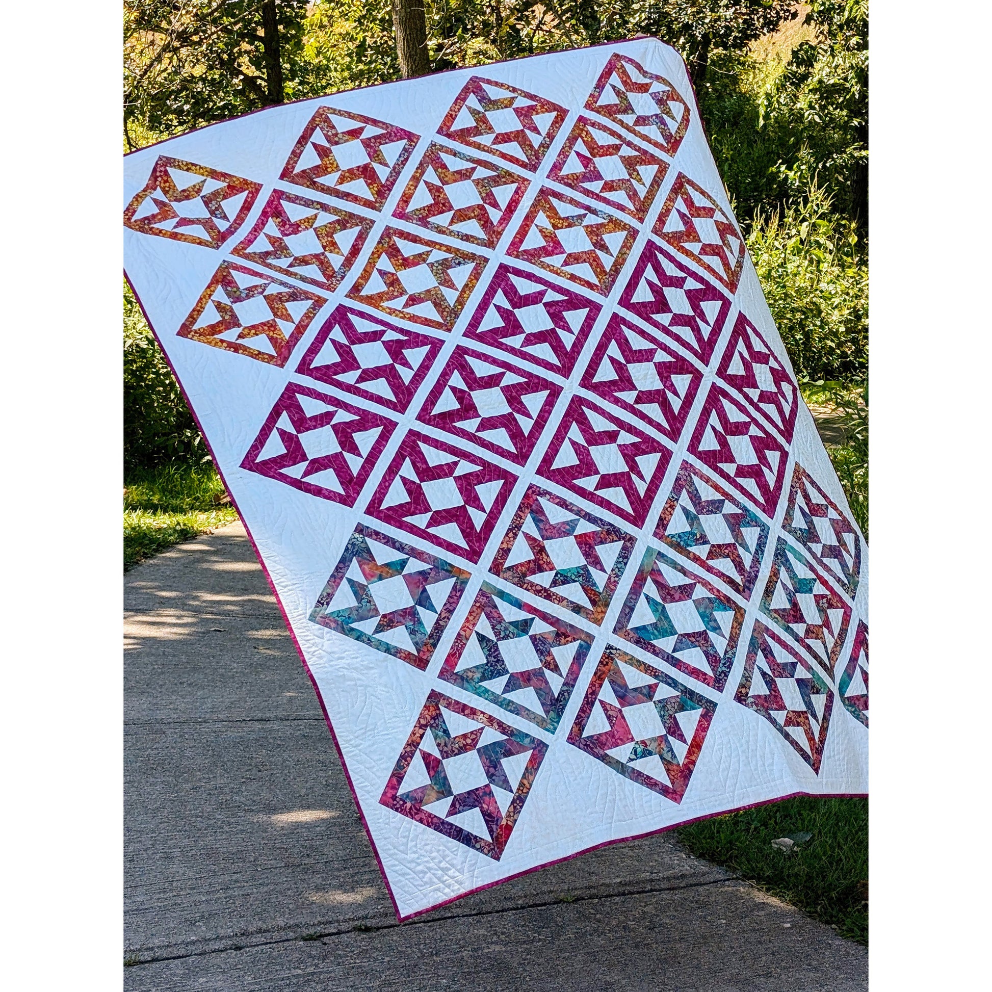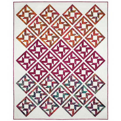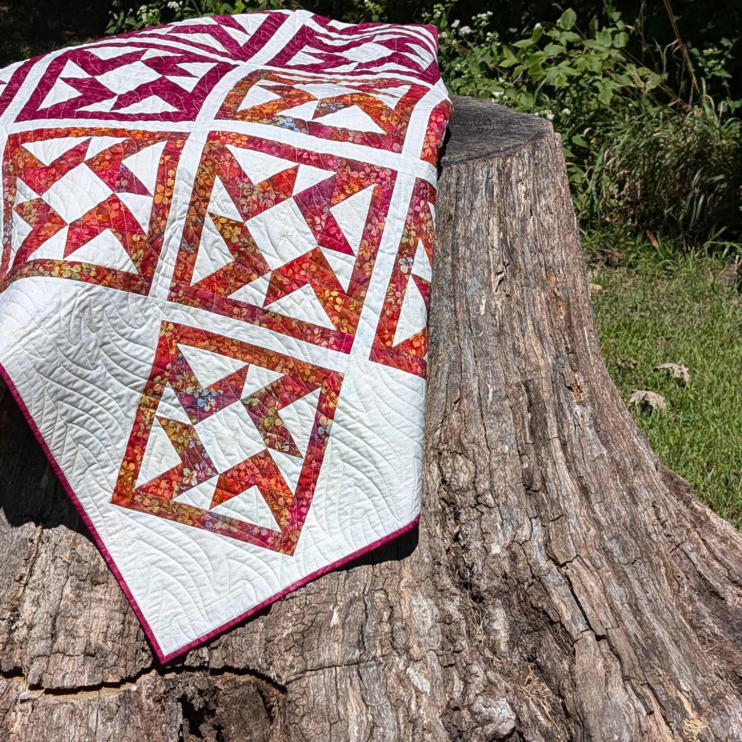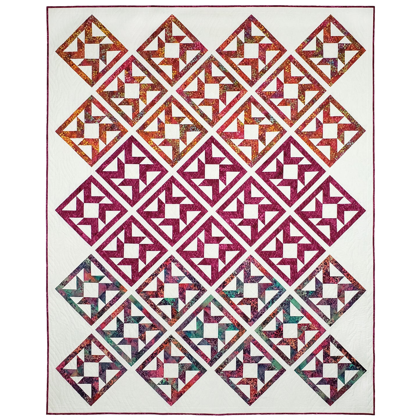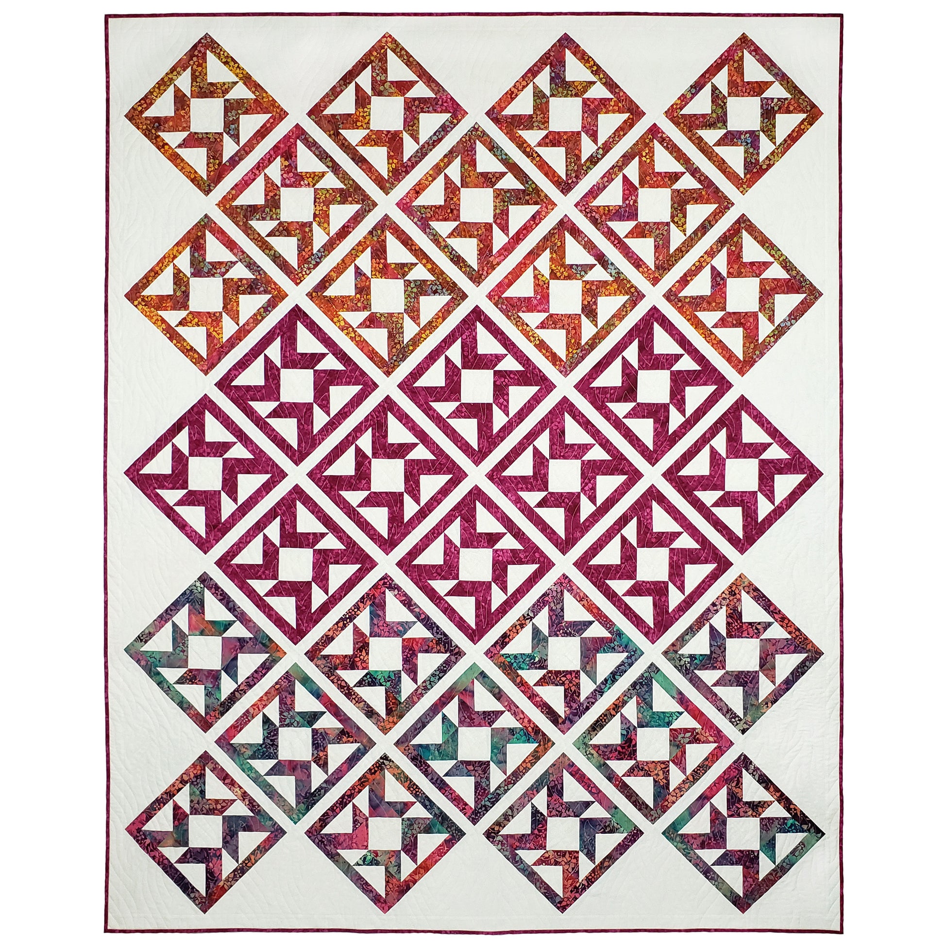 Spinning spark blocks are made without cutting and sewing any individual triangles. A simple block variation is included to create a bonus alternate quilt design. Design is suitable for confident beginners. Finished quilt will measure approximately 64” x 79”.
