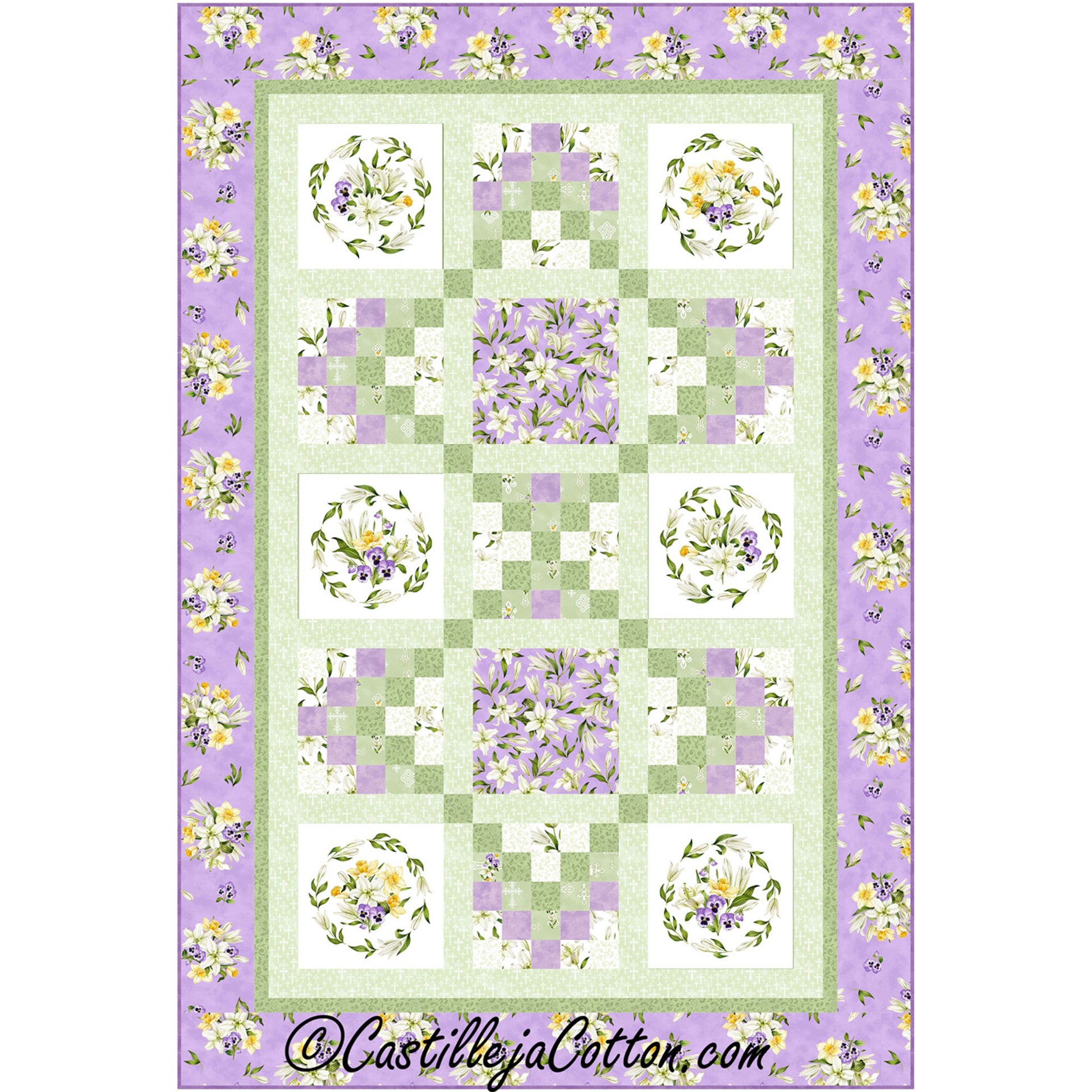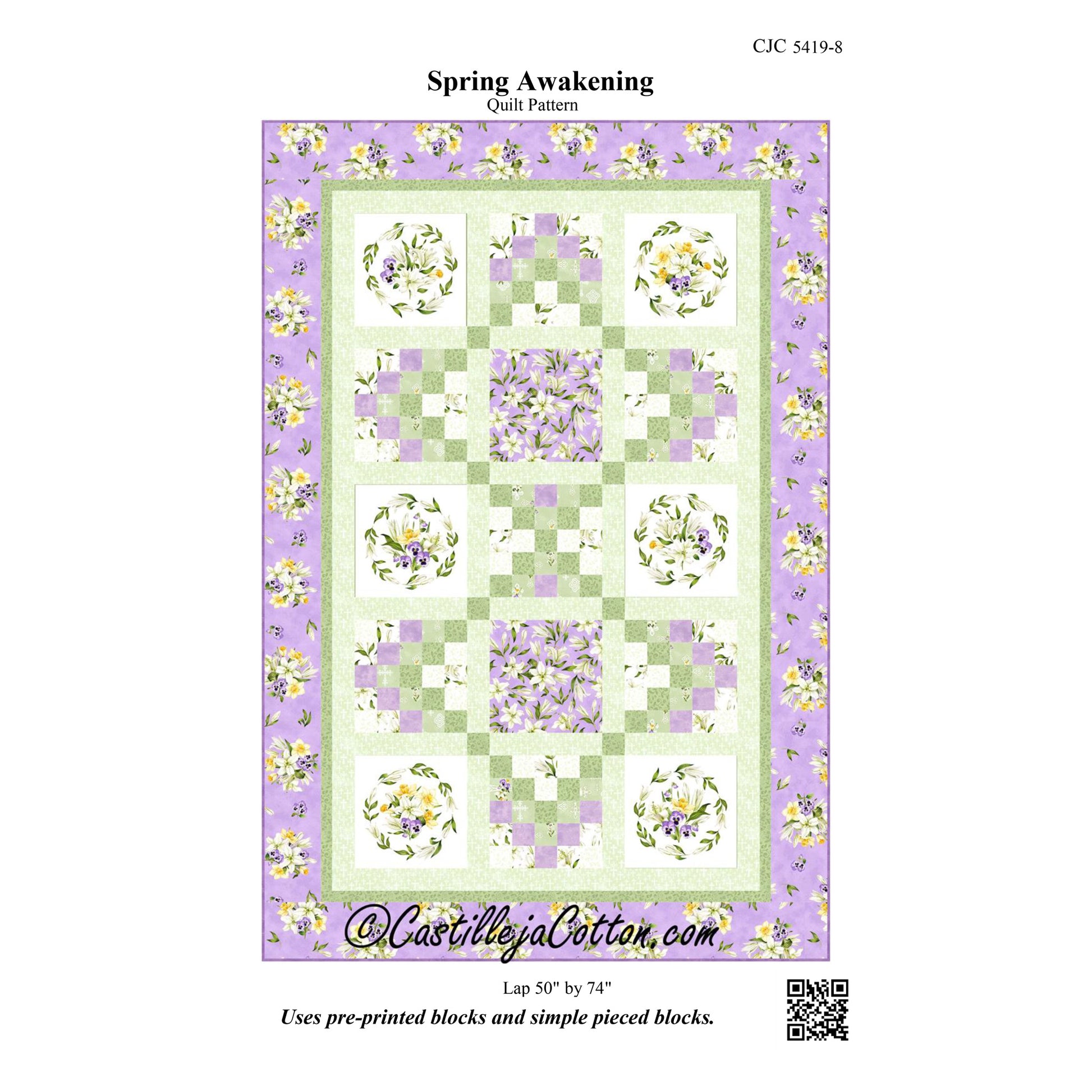 Uses pre-printed blocks and simple pieced blocks. Fabric shown in the sample quilt is Northcott Fabrics Spring Awakening (Available 2024-01-01). Colors: green, purple, white