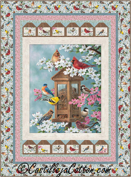 Easy to make lap/throw quilt featuring bird feeders block with a center panel.