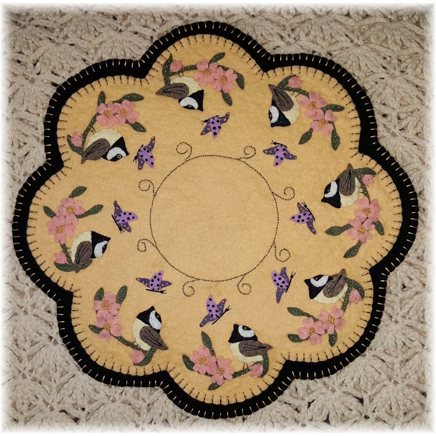 Curious little chickadees surround the edge of this pretty 12 inch candle mat. Stitch up this sweet design using wool felt or wool. Add a candle or small vase of flowers to bring a touch of Spring into your home. So sweet!
