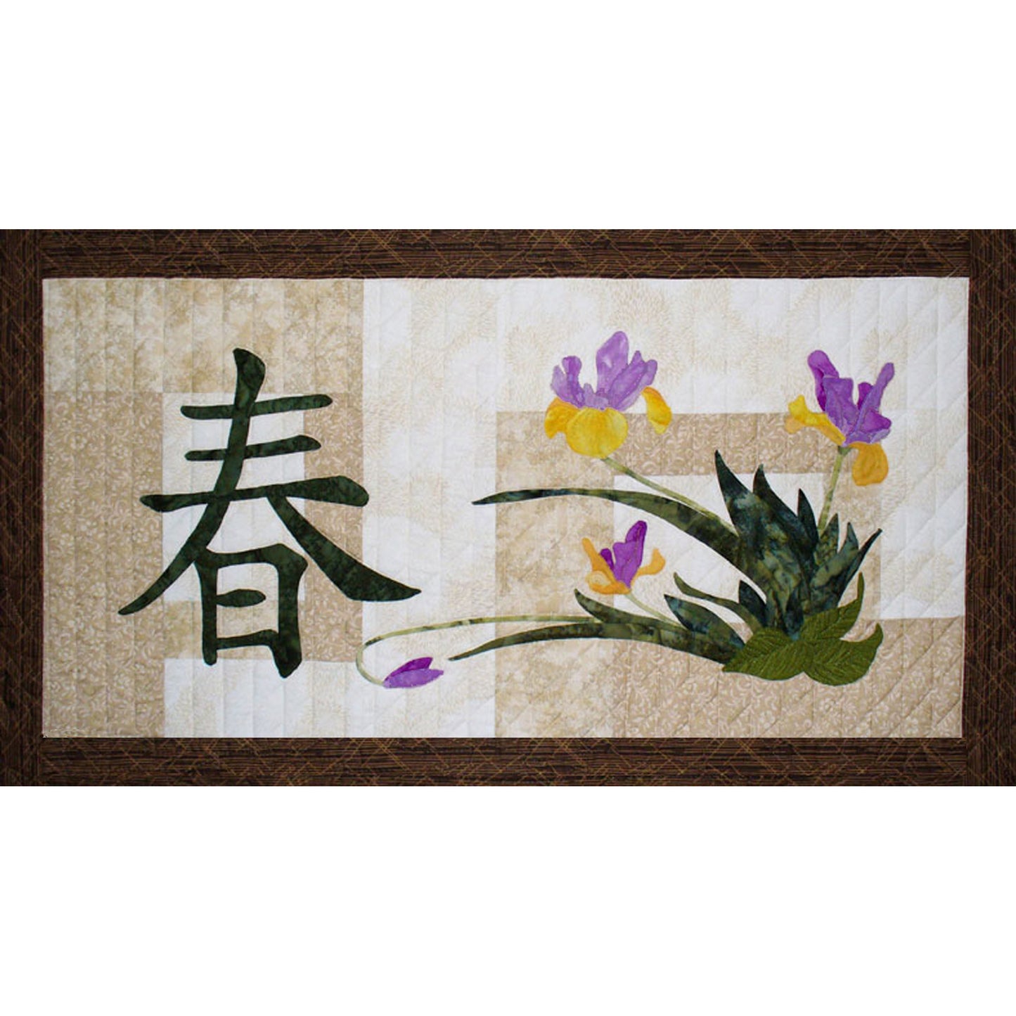 This Kanji symbol means Spring in both Japanese and Chinese. Combining it with irises results in a stunning seasonal wall hanging pattern. Additional options include single color background dimensions, and extra horizontal center lines for individual block construction if desired.Finished Size: Wall Hanging 18" x 33"