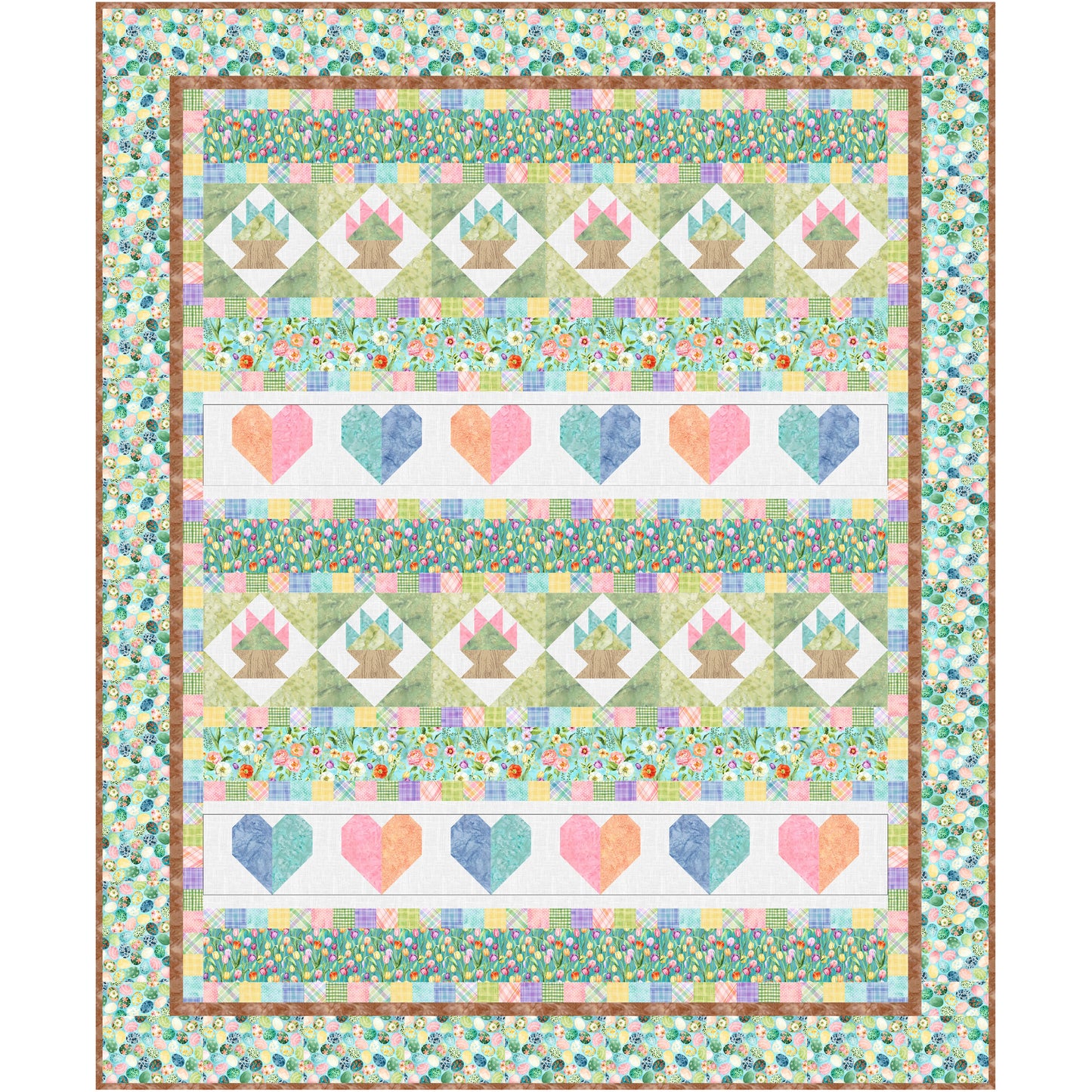 Spring quilt pattern shown in pastels with hearts and flowers. Change up the look with brighter or darker colors.