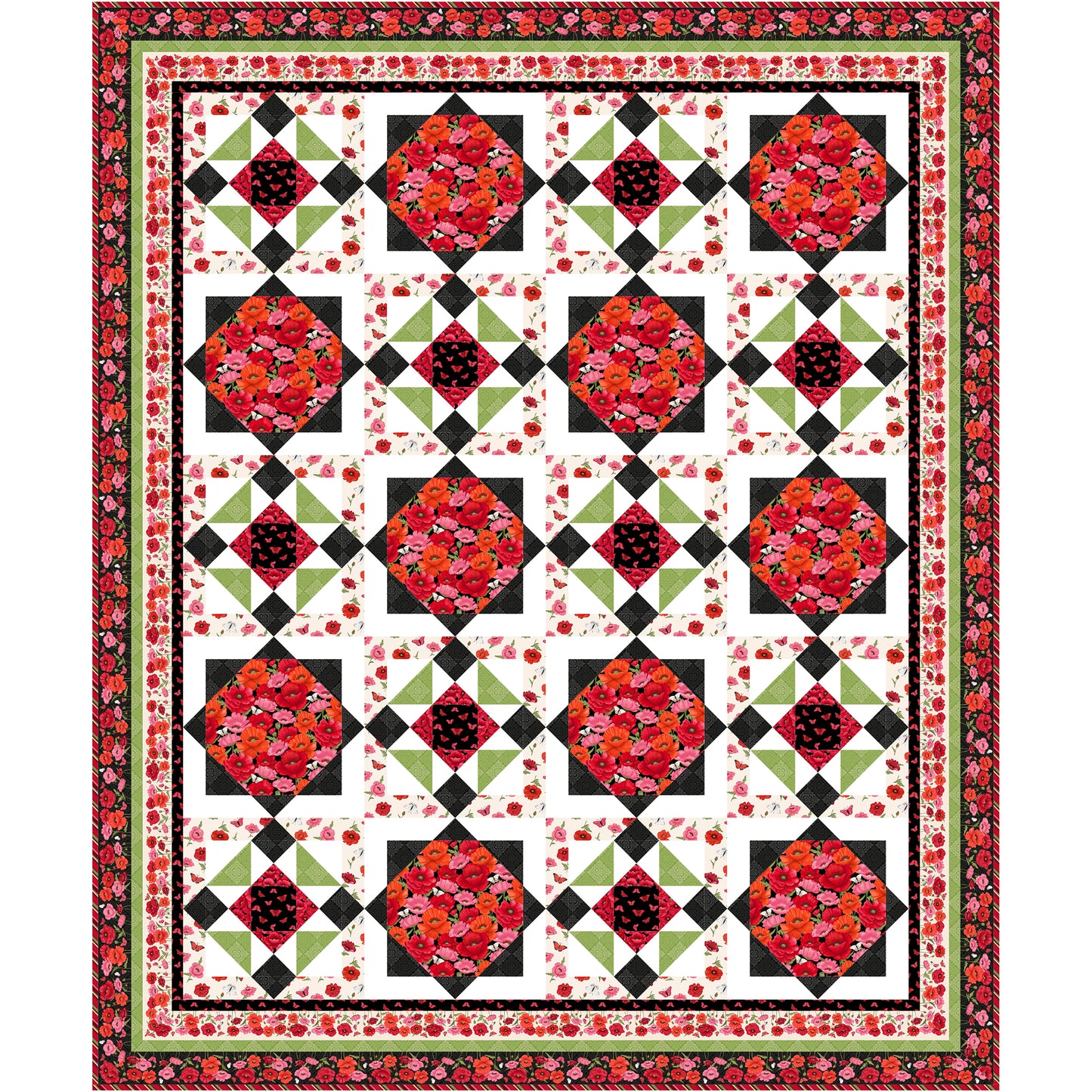 Strikingly brilliant quilt pattern is shown with fabrics in red, green and black to look like a field of poppies. Change up the colors and get lots of different looks.