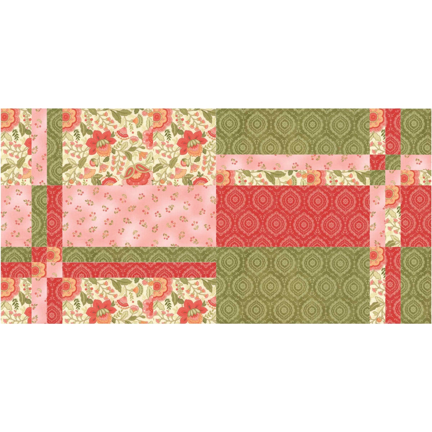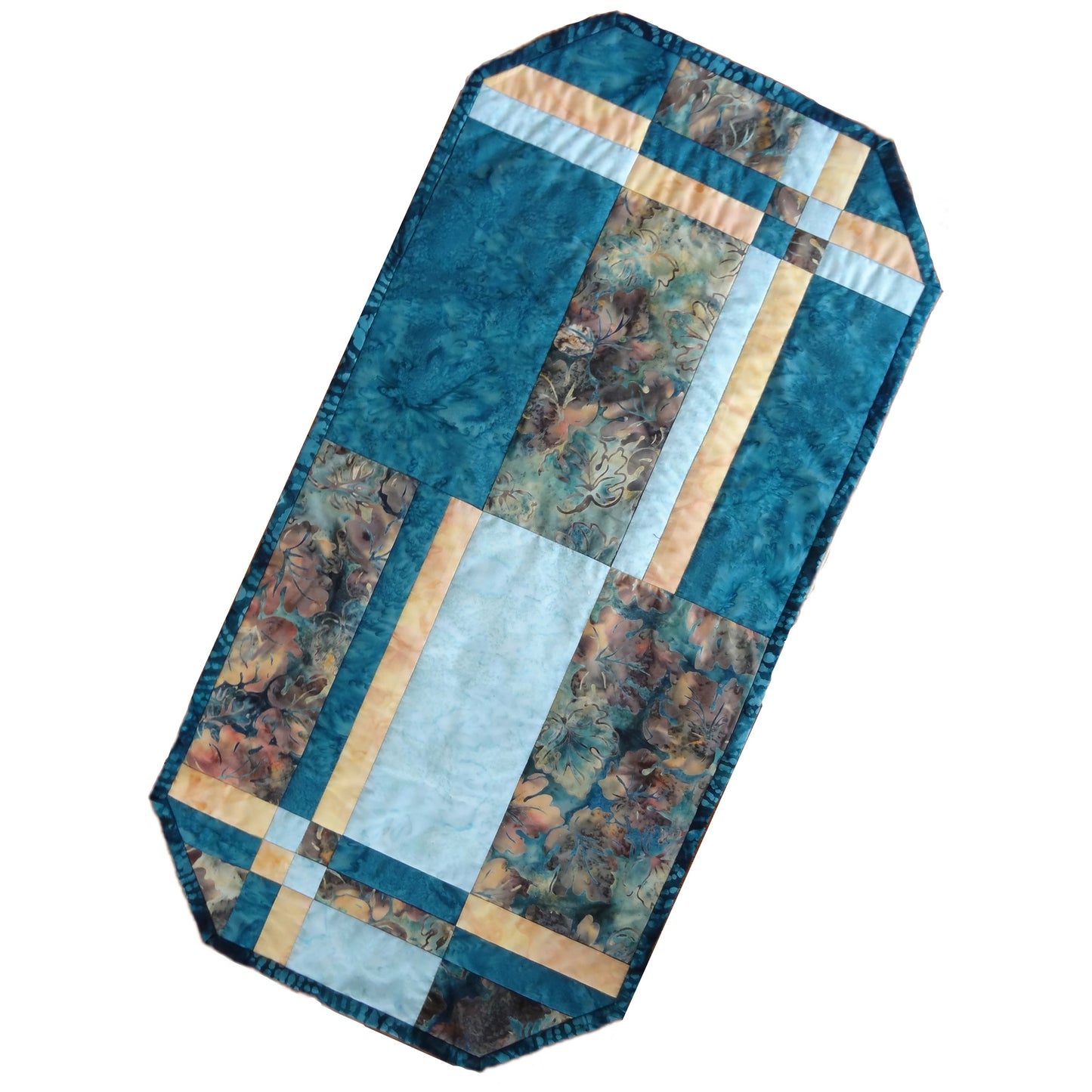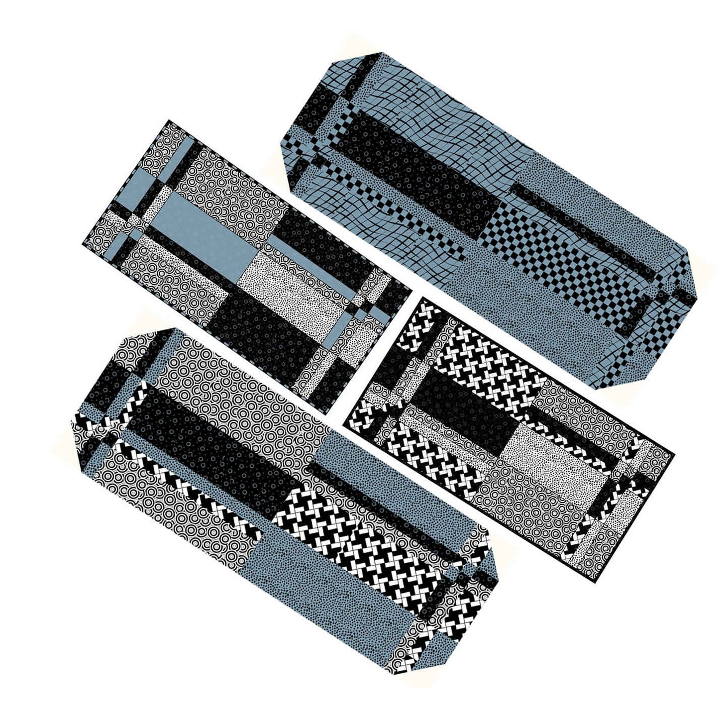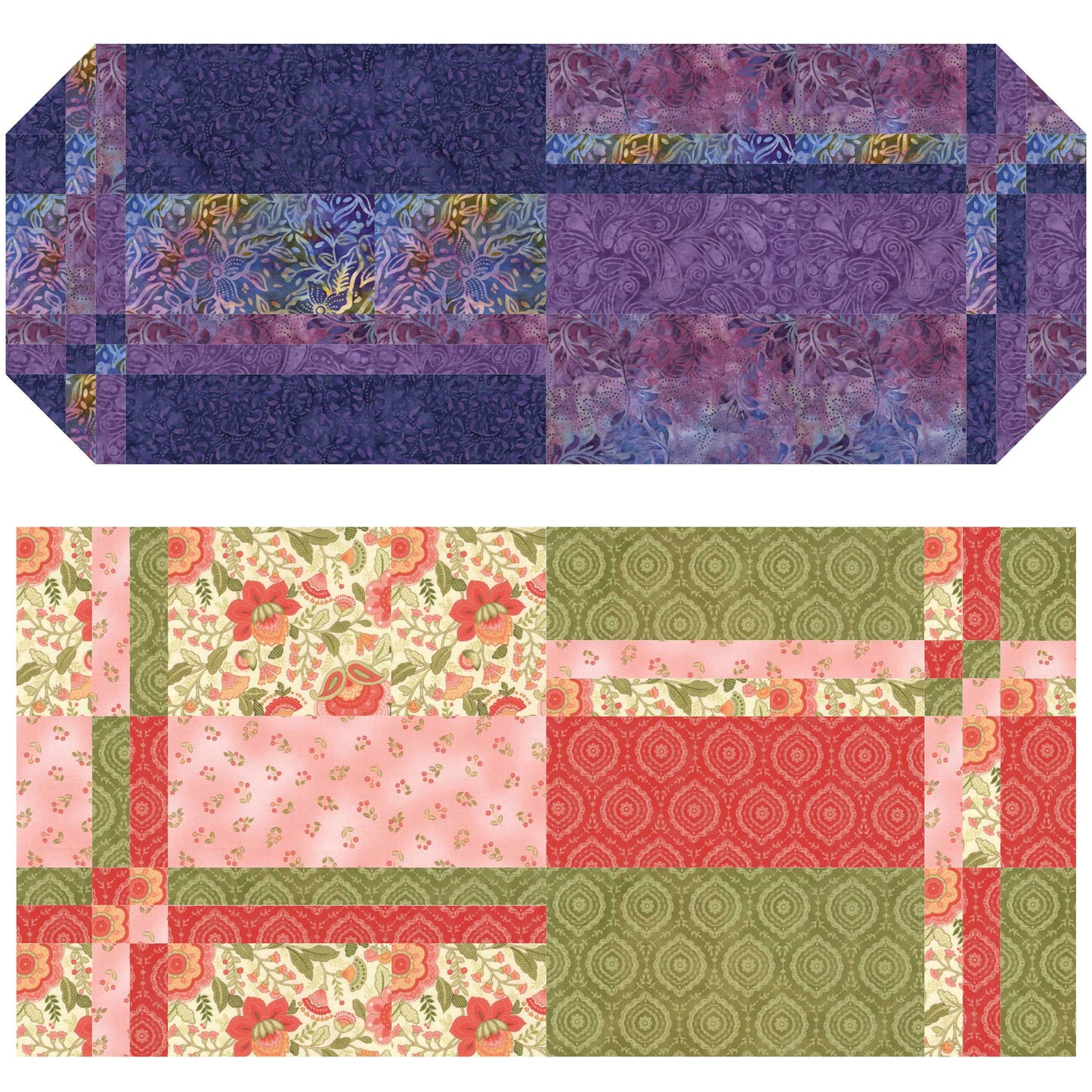 2 Sizes & 2 Shapes of table runners. Geometric fabrics give these table runners a modern look or soften the look with fabrics of your choice. Four fat quarters make both a short and long runner or one reversible runner.