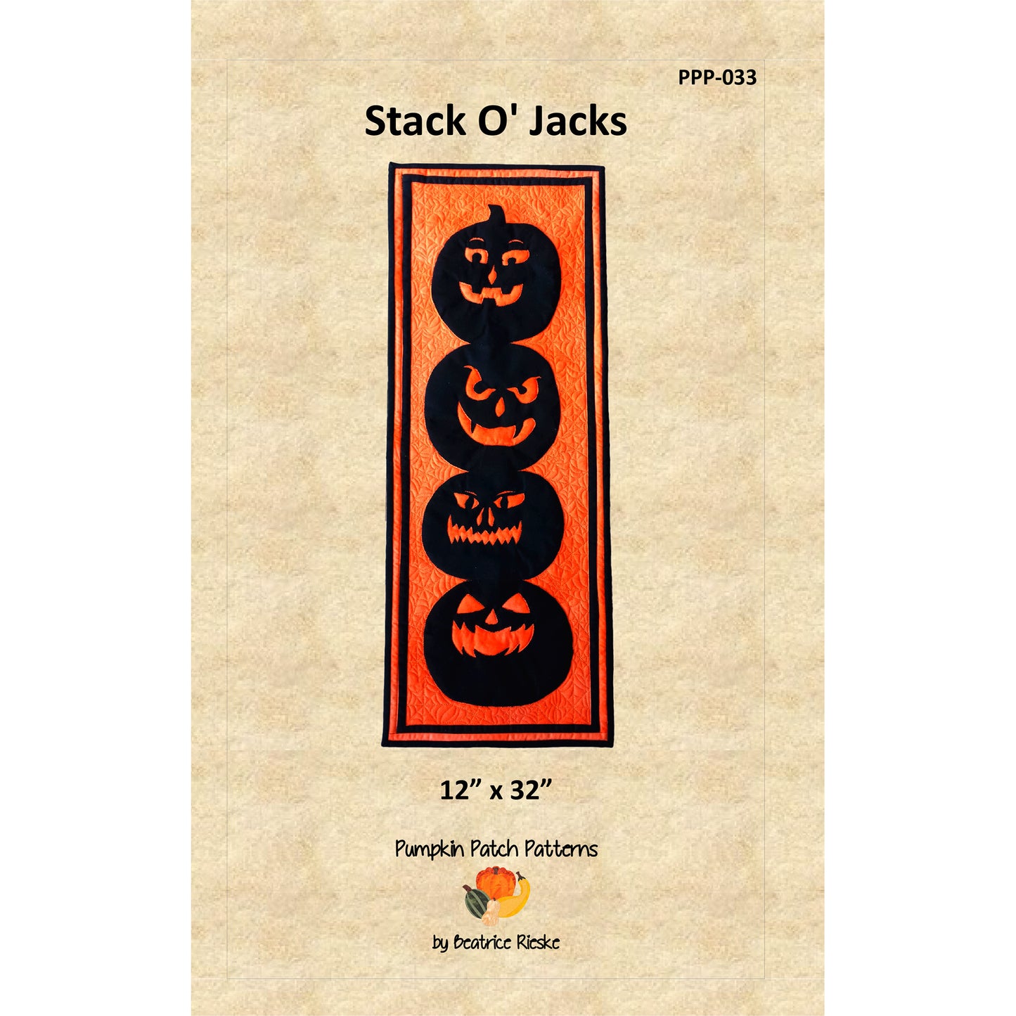 This funny bunch of Jack O' Lanterns, based on real-life carved pumpkins brings Halloween spirit to every home. It was designed as a wall hanging but can be used as a table runner too.Finished Size: Wall Hanging or Table Runner 12" x 32"