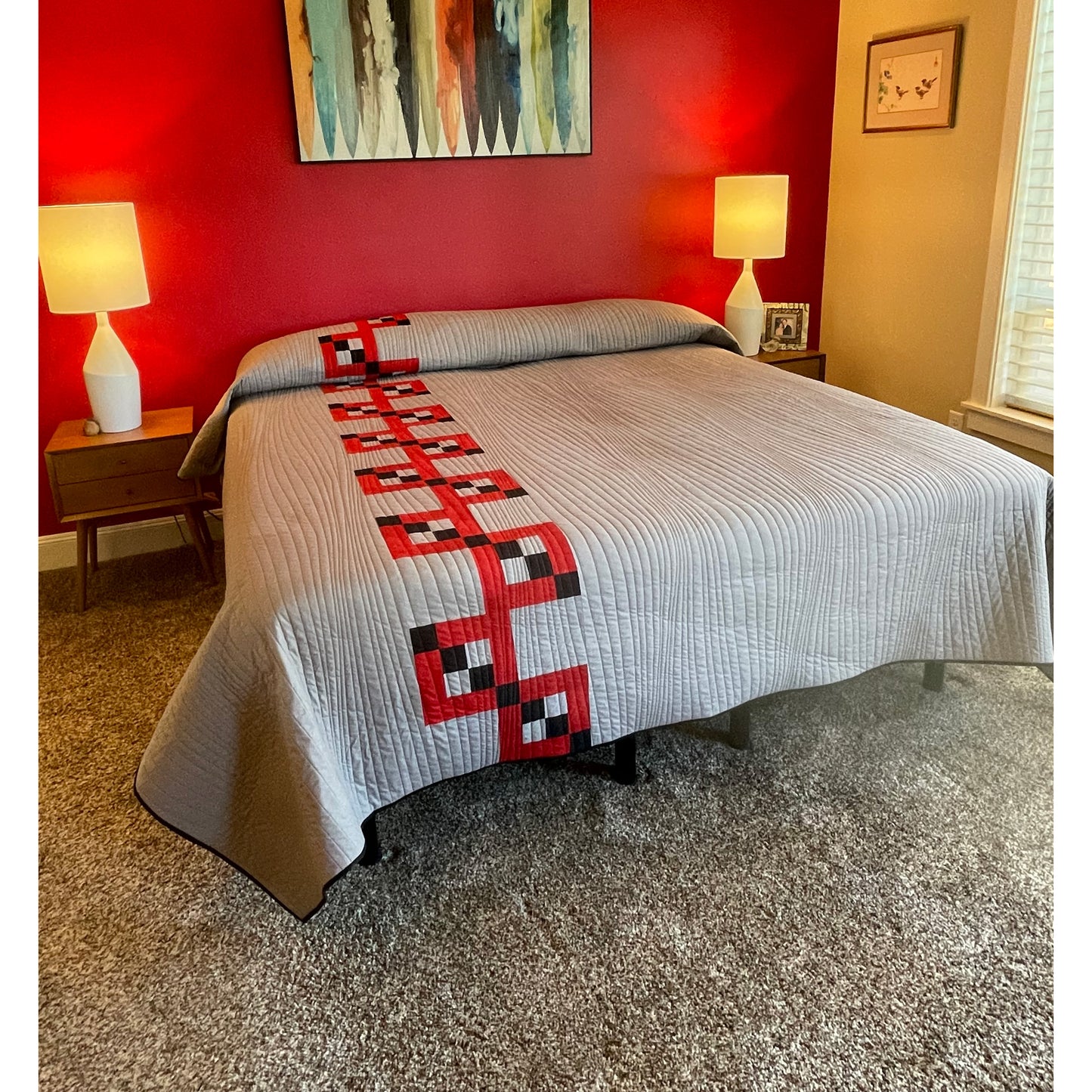 Stage Right offers lots of open space for creative quilting. This bold, modern design has just enough drama to make it interesting. It is a fast and easy quilt pattern for your bed and is offered in four sizes: King, Queen, Twin, and Throw.
