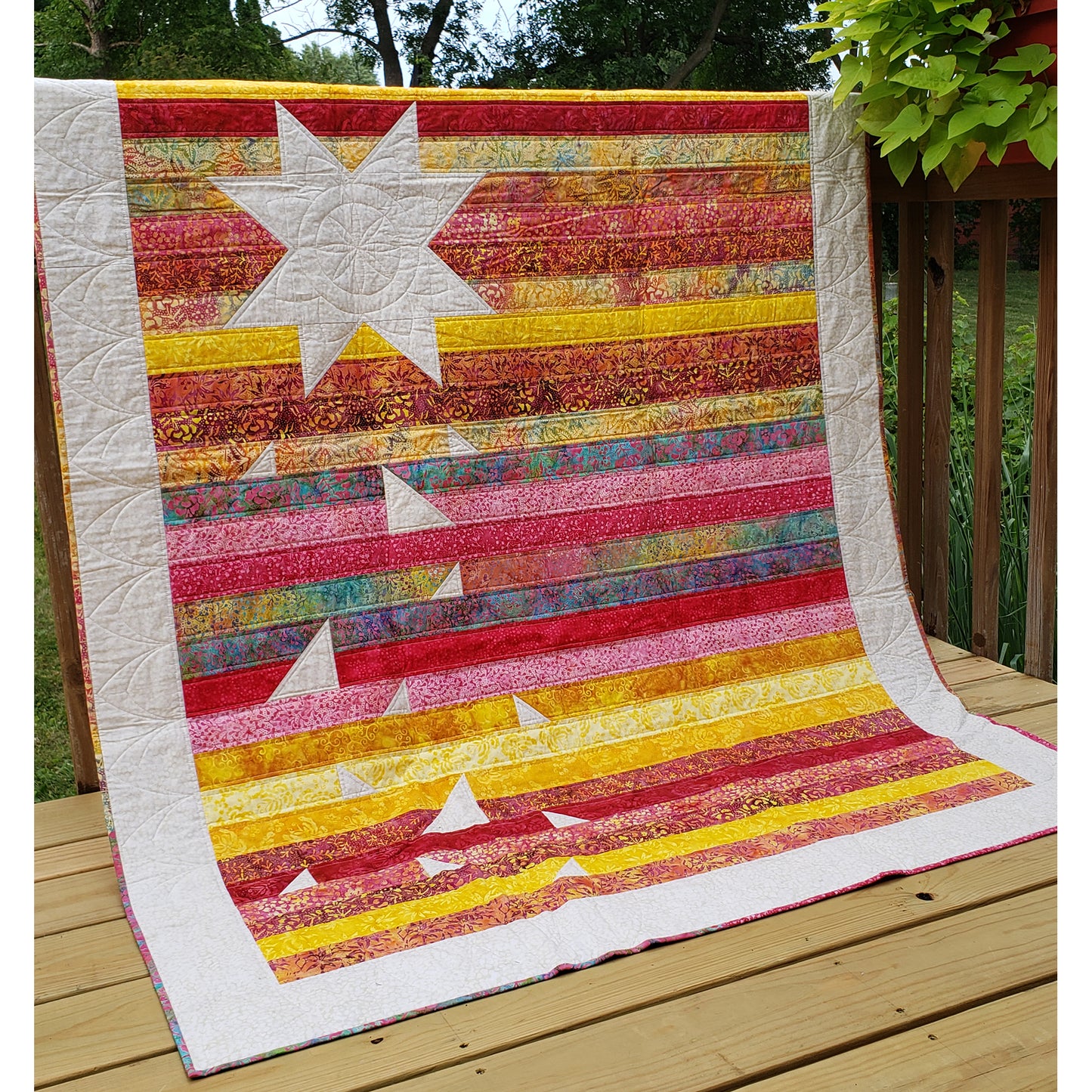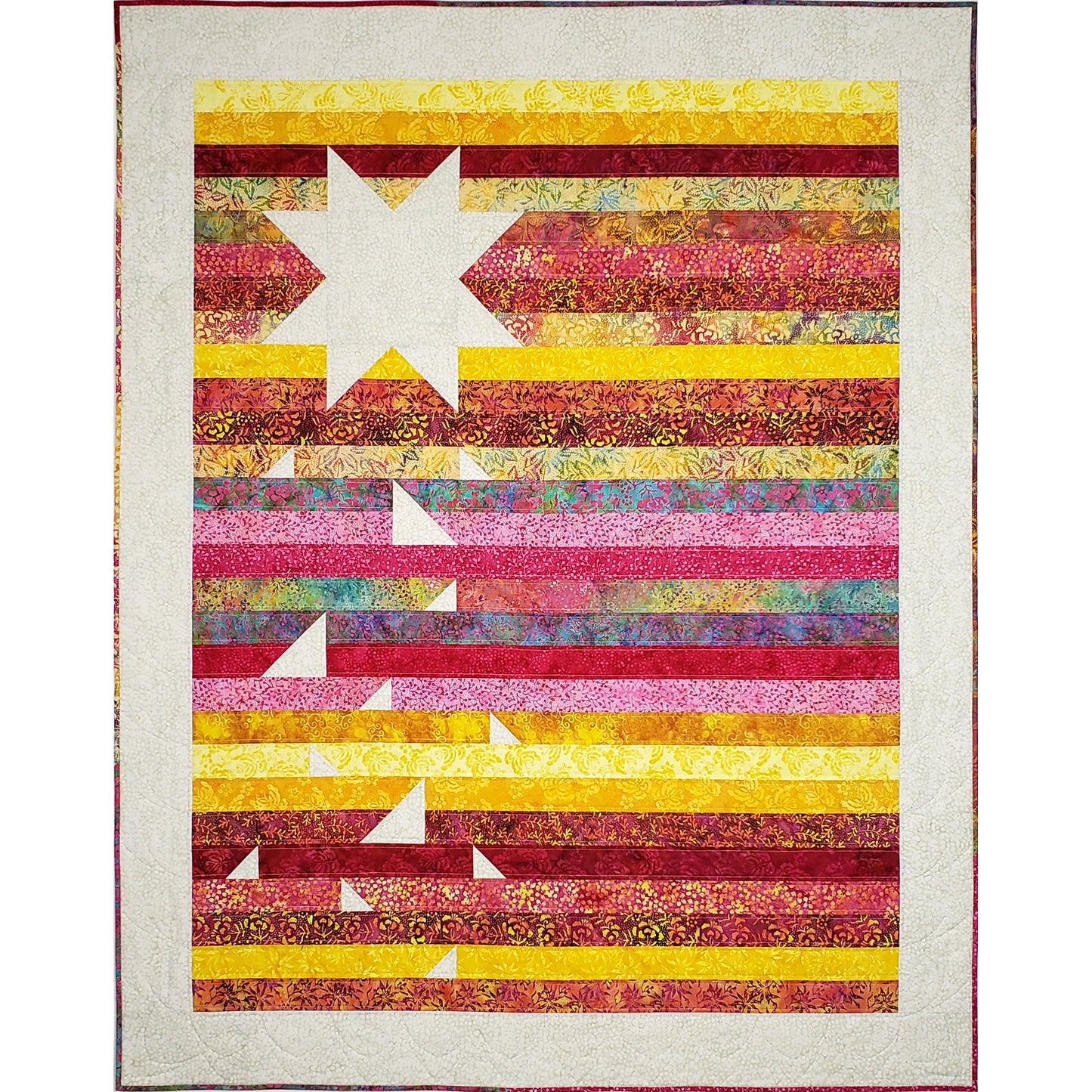Precut friendly! Use precut 2 ½” strips or cut some from your stash to make this quick and easy beginner-friendly quilt. Triangles are made with squares and a stitch-and-flip technique so there are no triangles to cut and no applique. Quilt measures approximately 49” x 65”. Quilt width stated is based on 40” width of fabric. Actual width will vary depending on the length of the shortest strip used.