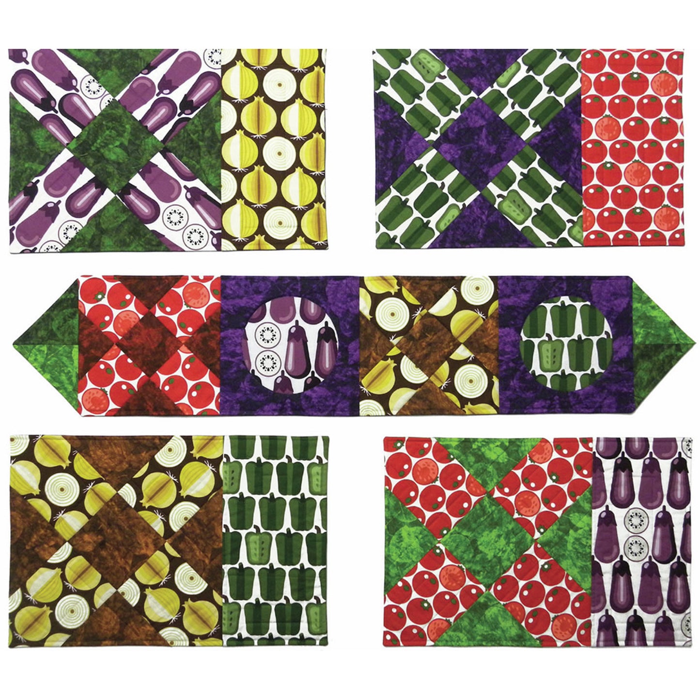 The Stir Fry Table Set Pattern makes placemats and a table runner with fun and easy no-binding contemporary styling. This is a great pattern to showcase a favorite print and a luscious blender combination. The skinny runner combines eight inch "X" and "O" blocks while the placemats make a bold statement with twelve inch "X" blocks. Best of all, even a beginner quilter can sew these table accessories up successfully and have the satisfaction of a job well done while learning basic piecing skills.Samples were made using Earthlight by Yolanda Fundora (designer of this great table set pattern) and Veggie Patch by Hoodie.