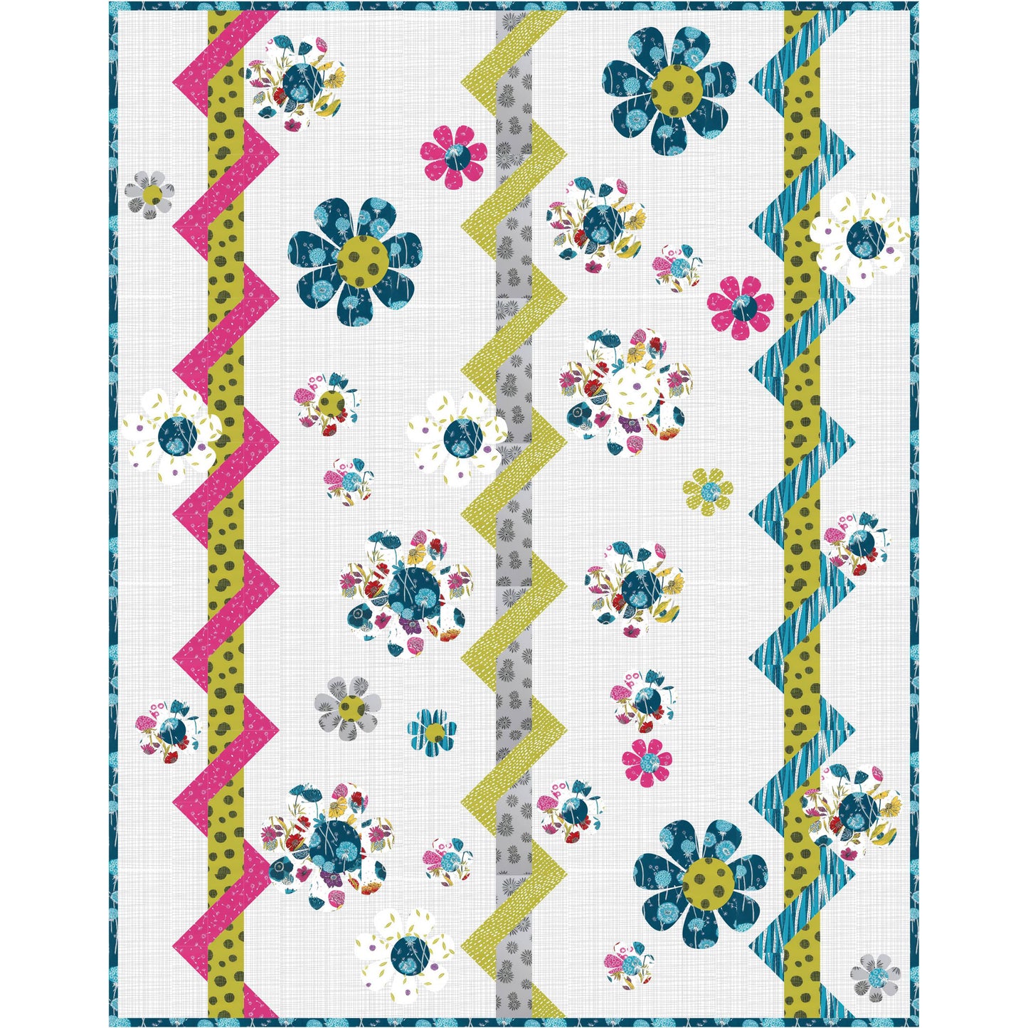 This delicious pattern inspires thoughts of summer gardens. The flowers are appliqued after the piecing is all done. The quilt measures approx. 44” x 56”.