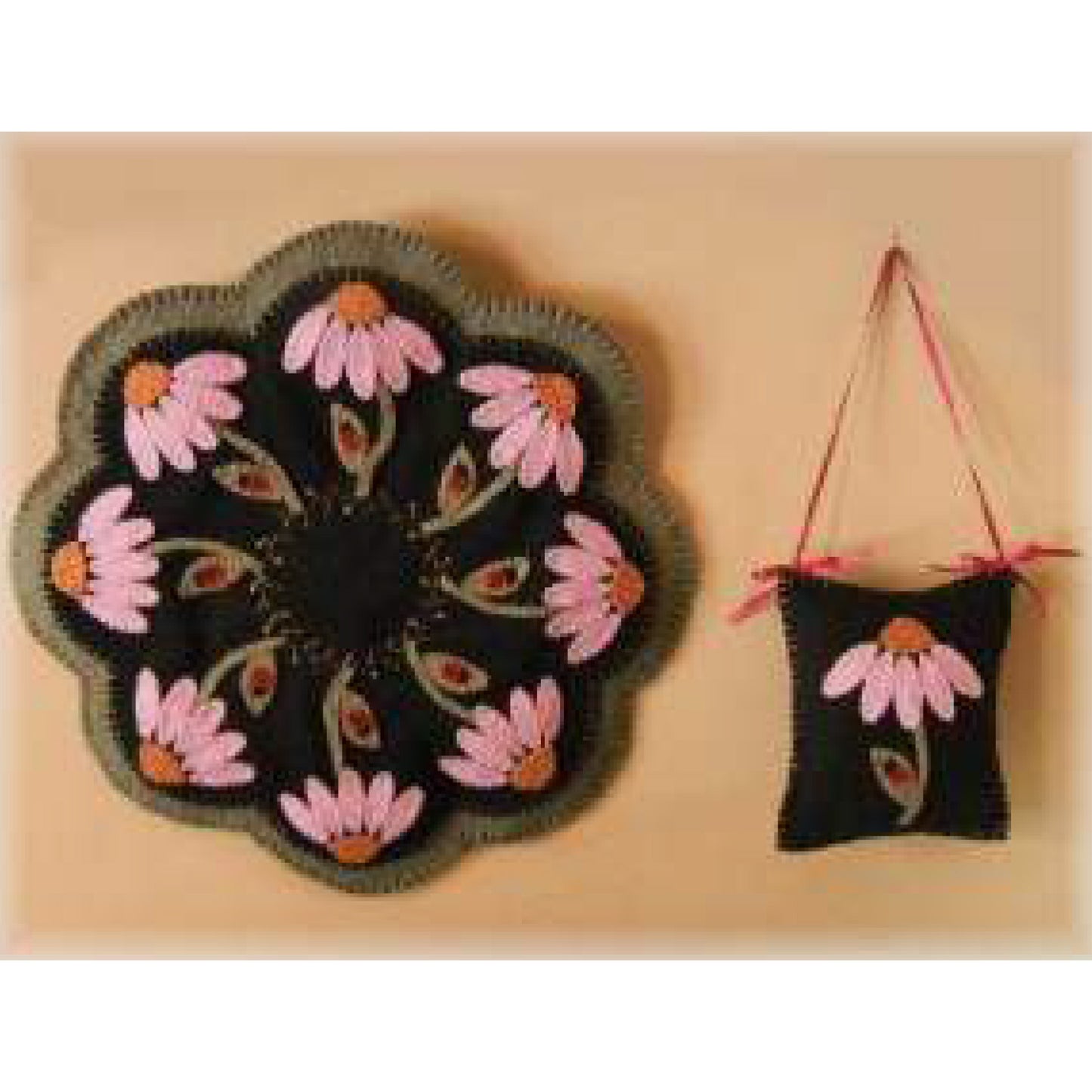 Beautiful purple coneflowers grace the scalloped edge of this pretty candle mat. The finished mat measures approximately 13 inches. The matching hanging pillow measures 5 by 5 1/2 inches. Both patterns can be easily stitched up using wool or wool felt. A summertime decorating delight!