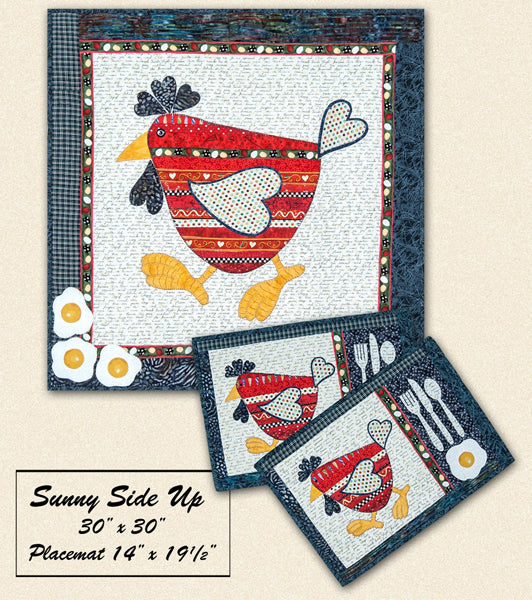 Whether you're a country mouse or a city mouse, this cheeky chicken wallhanging with coordinating placemats will surely enhance your kitchen decor. She will make you smile and remind you to keep "Your Sunny Side Up"! The body of the chicken can be constructed by using a variety of fabric strips; using one print, or think outside the box and make her in your own funky or traditional color combo. Create this wallhanging for yourself, a fowl-loving friend or family member. The machine appliqué wallhanging and co-ordinate placemats includes full size templates. Cluck! Cluck! Finished size: Wallhanging 30" x 30". Placemat is 14" x 20"