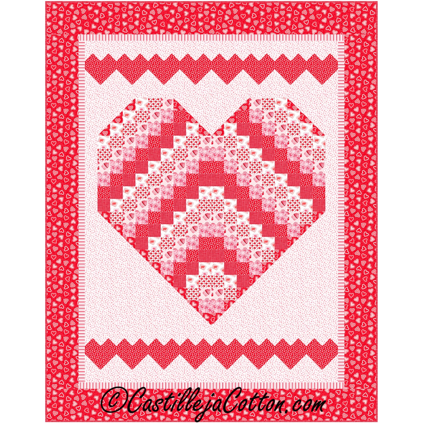 Large heart pieced with 2" squares. Pieced small heart borders. Fabric shown in the sample quilt is Patrick Lose Fabrics Sweet Love (Available 2024-06-01). Colors: red, white