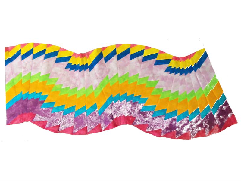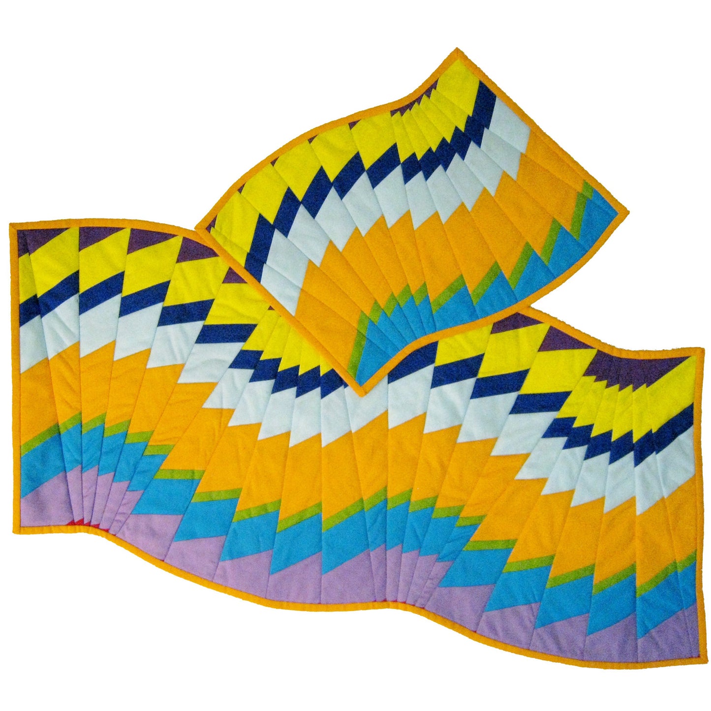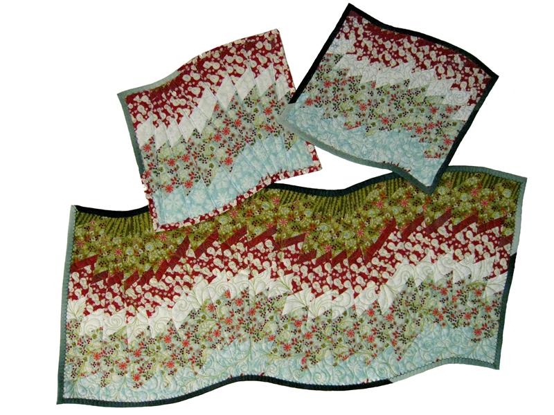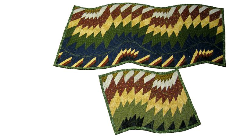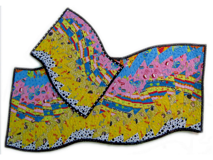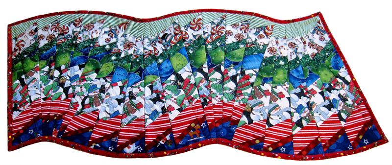 Do not be intimidated by how this swirling table runner looks finished-it's like "a slight of hands"! No seams to match, no curves to cut; just AMAZING results. This is a very forgiving technique. Make simple strip stratas and cut them with a 9 degree ruler and lay on the 60 degree line. Cutting across the stratas on a slant gives the table runner a whole different look! This quilt pattern is so easy to make. Use prints or solids or combinations - anything goes here. It's magically fun!